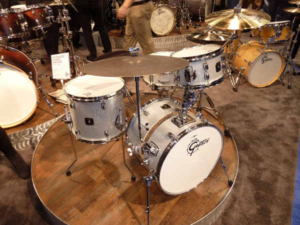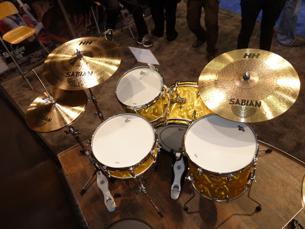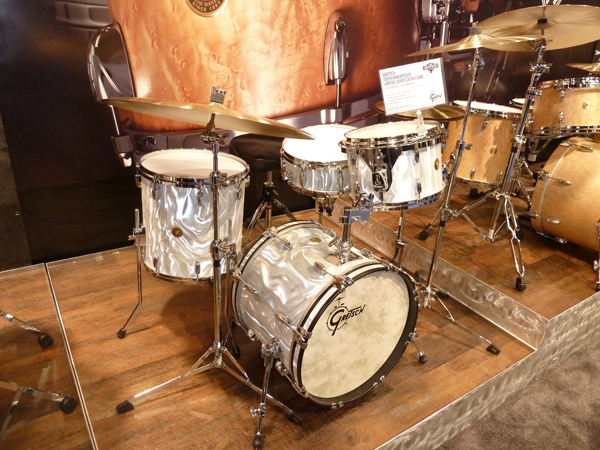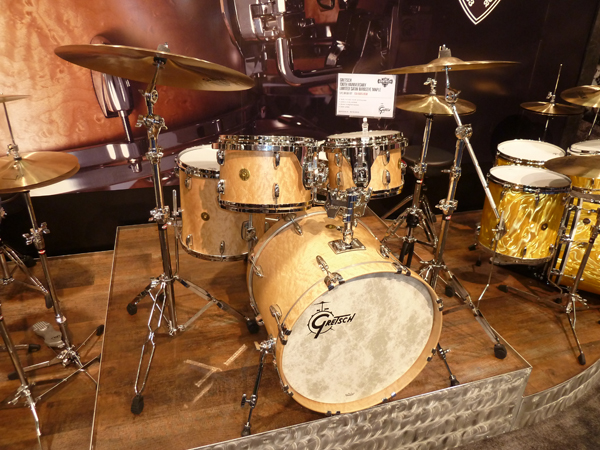 Magnifique kit Gretsch USA avec les pics de grosse caisse et l'attache tom banane à l'ancienne. Cette réédition 130 TH anniversary sera bientôt dispo à la Baguetterie