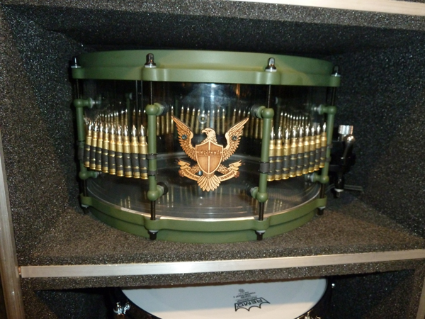Collaboration avec Sabian pour cette magnifique caisse claire DW en bronze (Sabian) et bouleau à la finition vintage pour les coquilles.