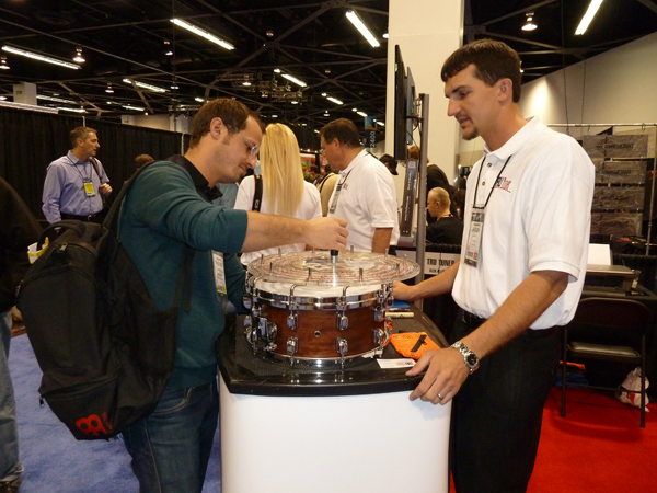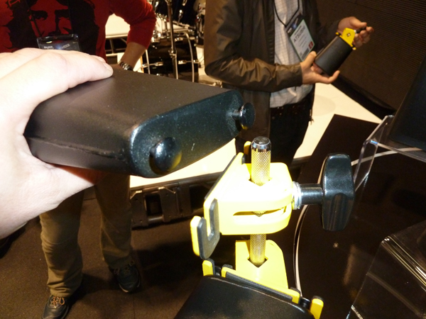 Cette petite chose toute discrète est sans doute la plus invention que nous avons pu voir sur ce salon. Il s'agit d'une coquille universelle (attache tom, cloche, tambourin etc.) mais la grande idée c'est qu'il s'agit aussi d'une coquille de serrage de tom au filetage universel. Elle se fixe en lieu et place d'une coquille de n'importe quel marque de batterie grâce à son entraxe réglable.