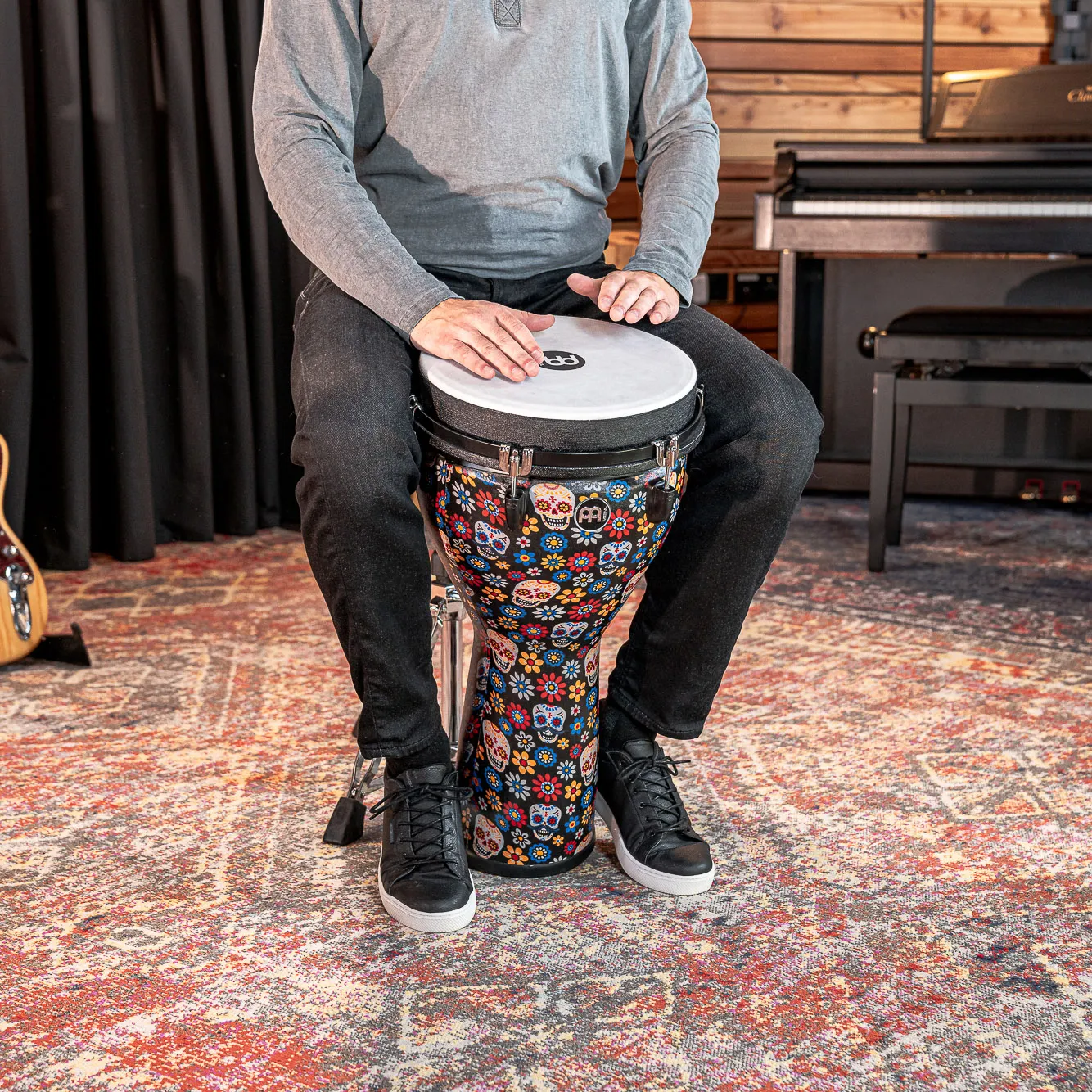 La peau 100% synthétique ne se désaccorde pas avec les changements de température ou d'humidité et se combinent pour produire des slaps nets et ciblés et des basses robustes. Sa construction légère fait de ce djembé un compagnon de voyage idéal.