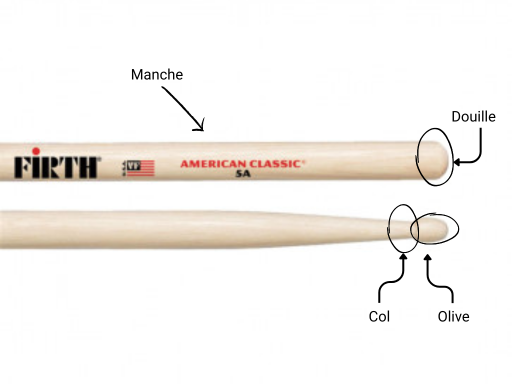 Les baguettes, qu'elles soient destinées à des batteries électroniques ou acoustiques sont composées de la même façon. On distingue trois parties dont vous pouvez modifier les paramètres dans une baguette, et la douille. Cette dernière est taillée dans la même pièce que le reste de la baguette et est donc identique à celle-ci, à l’exception des paires de baguettes de tambour militaire traditionnel de prestige qui possèdent des douilles en laiton, nickel, cuivre ou acier.