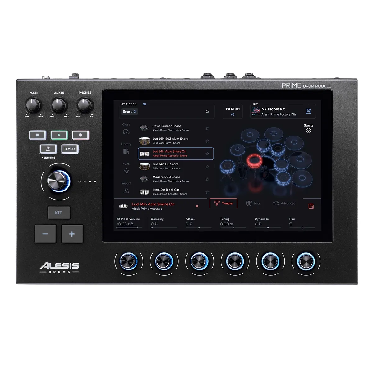 Grâce à l'écran tactile intuitif, la configuration de votre kit est rapide et aisée. Vous pouvez ajuster chaque tom, chaque son et les effets en toute simplicité. Il y a également six encodeurs rotatifs pour un défilement rapide grâce à l’écran tactile, ainsi qu’un encodeur principal pour les boutons de volume dédiés aux sorties principales, smartphones et auxiliaires.