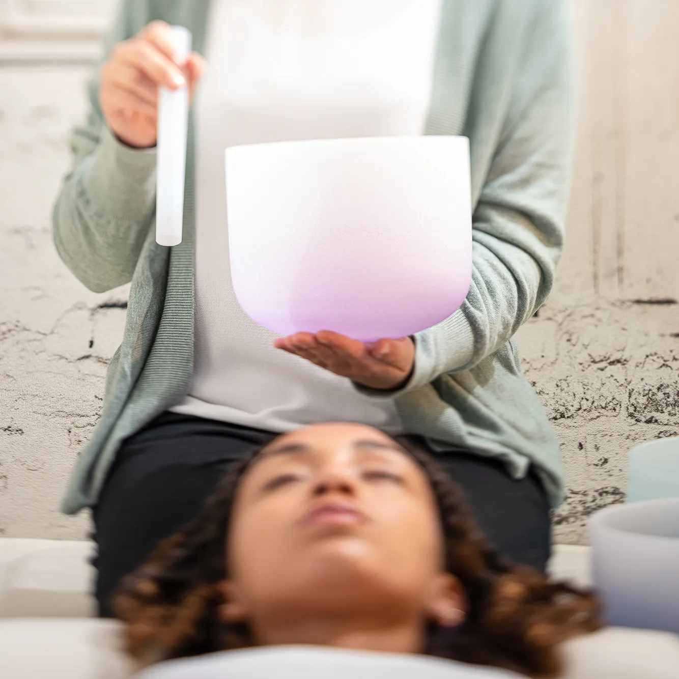 Tous les bols chantants en cristal sont livrés avec un anneau en silicone pour éviter d'éventuels chocs et assurer la meilleure résonance. La fondamentale A4/a' est réglée sur 440 Hz.