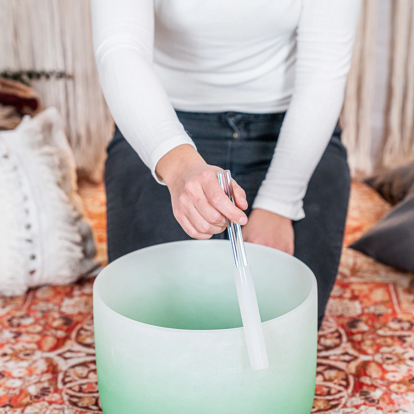 Tous les bols chantants en cristal sont livrés avec un anneau en silicone pour éviter d'éventuels chocs et assurer la meilleure résonance. La fondamentale A4/a' est réglée sur 440 Hz.