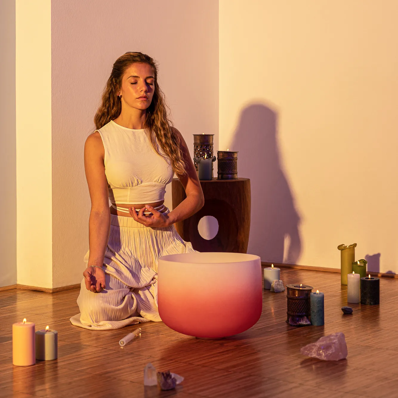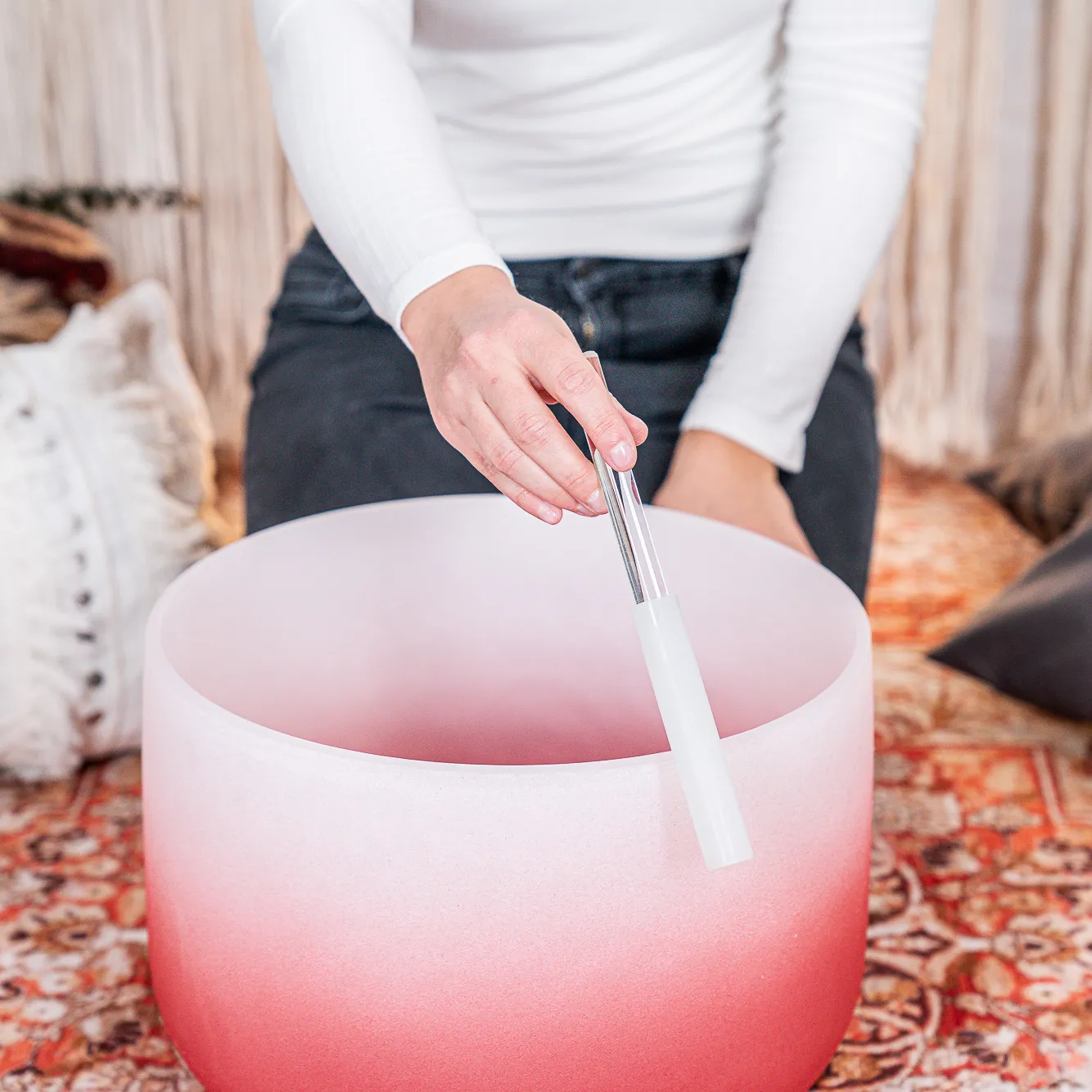 Tous les bols chantants en cristal sont livrés avec un anneau en silicone pour éviter d'éventuels chocs et assurer la meilleure résonance. La fondamentale A4/a' est réglée sur 440 Hz.