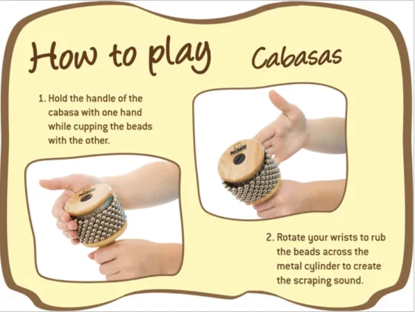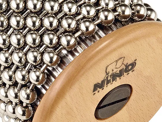 Le NINO Cabasas sont fabriqués à partir d'un cylindre de bois recouvert d'une plaque métallique ondulée, qui est entourée par un filet de billes de métal. En tenant la poignée avec une main et le grattage des perles de métal de l'autre côté sur la plaque de métal crée le son de cabasa classique. Le plus petit modèle 2 "a été spécialement conçu pour la main d'un enfant.