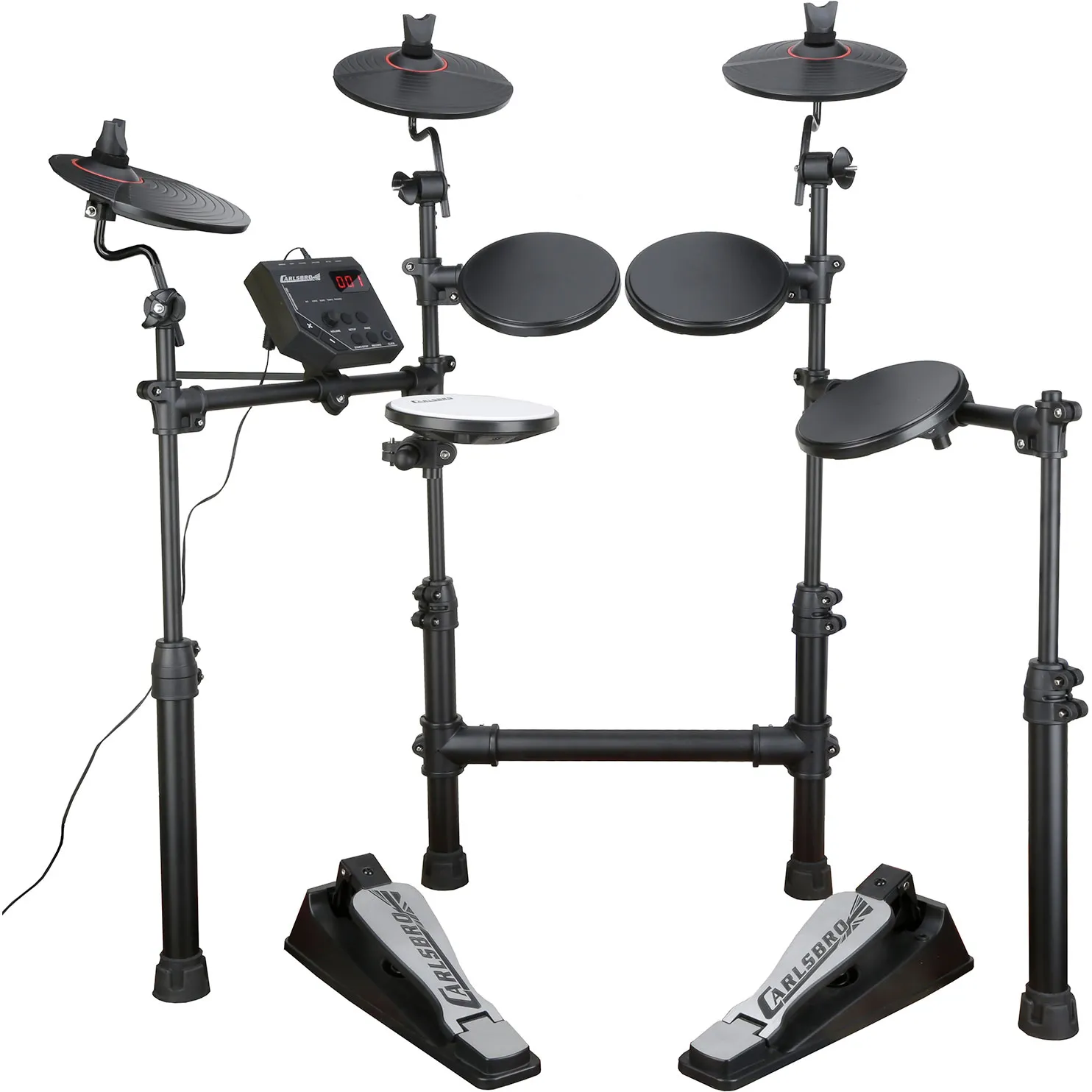 - Comporte: 1 x module Commander 101, 1 x pad de caisse claire 7", 3 x pad de tom 7", 1 x cymbale de charleston 8", 1 x cymbale crash 8", 1 x cymbale ride 8" simple zone, 1 x pédale kick pour grosse caisse, 1 x pédale de contrôle de charleston, 1 x stand à 4 pieds de hauteur réglable, 1 x paire de baguettes