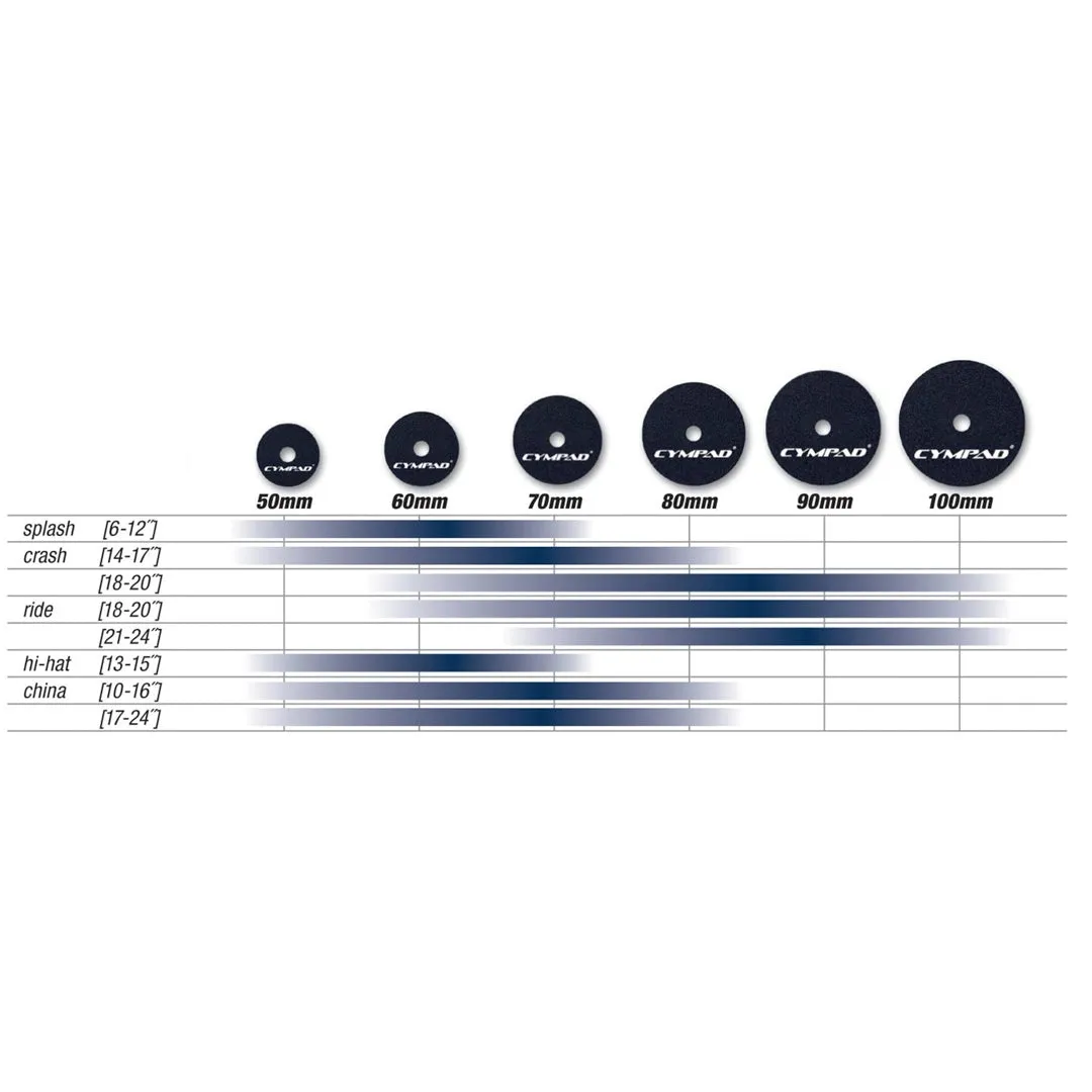 L'anneau a une épaisseur de 15mm et est disponible dans les diamètres 50, 60, 70, 80 et 90mm. Ce choix permet au batteur d'adapter le volume des cymbales selon les circonstances; dans les petits locaux avec de fortes réflexions, le Cympad s'avère particulièrement utile: des essais ont démontré que l'application des Cympads dans les diamètres 80mm et 90mm permettent de réduire le volume des cymbales de 20 à 25%!