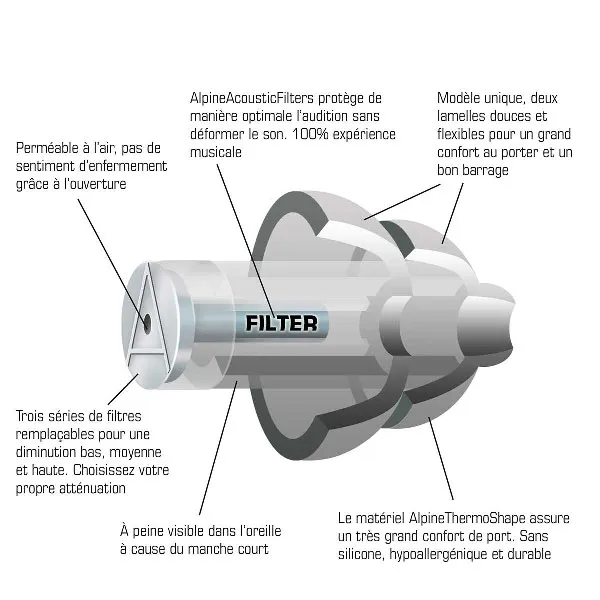 Contrairement aux protections auditives classiques, les bouchons Alpine sont équipés de filtres qui diminuent de manière plus linéaire toutes les fréquences audibles afin d'obtenir un bon équilibre entre aiguës, médiums et basses, à un niveau sonore plus faible.