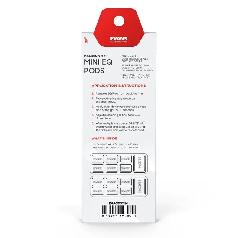 Sculptez votre son avec les EQ Pods EVANS, la solution ultime pour atténuer les harmoniques, maîtriser la résonance et affiner votre accordage. Ces morceaux de gel polymère bénéficient d'un revêtement en Téflon sur le dessus qui les protège contre les tâches et les déformations. Conçus pour stimuler votre créativité, ils peuvent être appliqués et retirés sans perdre leur adhérence, leur forme ou leur efficacité.