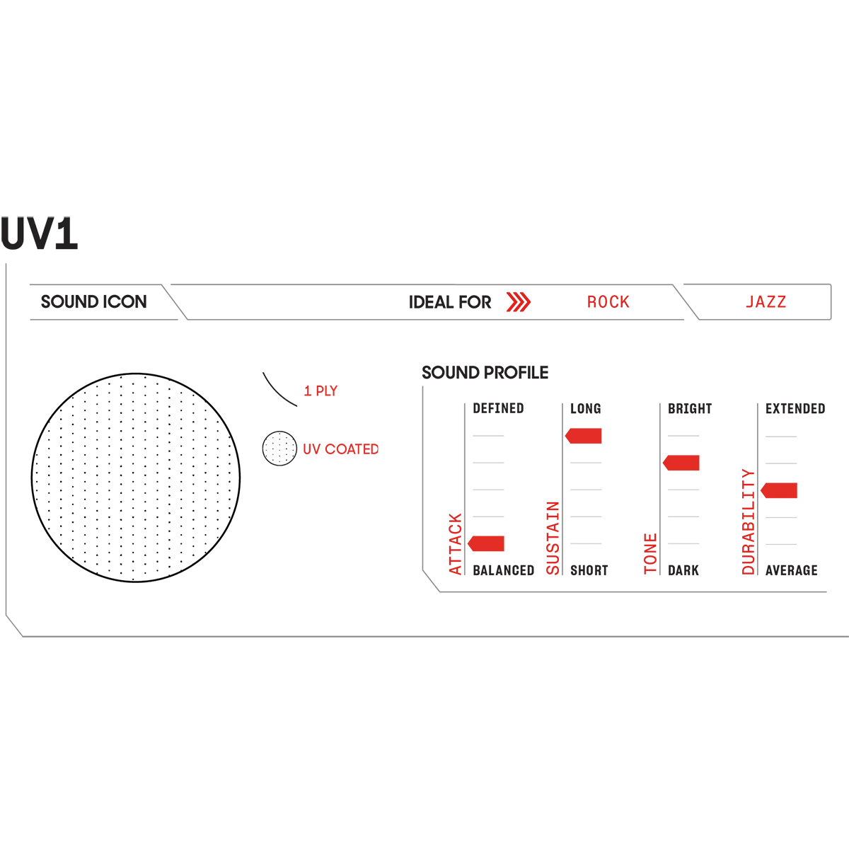 - Les peaux UV1 ont une attaque très équilibrée, un long sustain, une brillance modérée et une durabilité accrue par rapport à la moyenne des peaux simples.