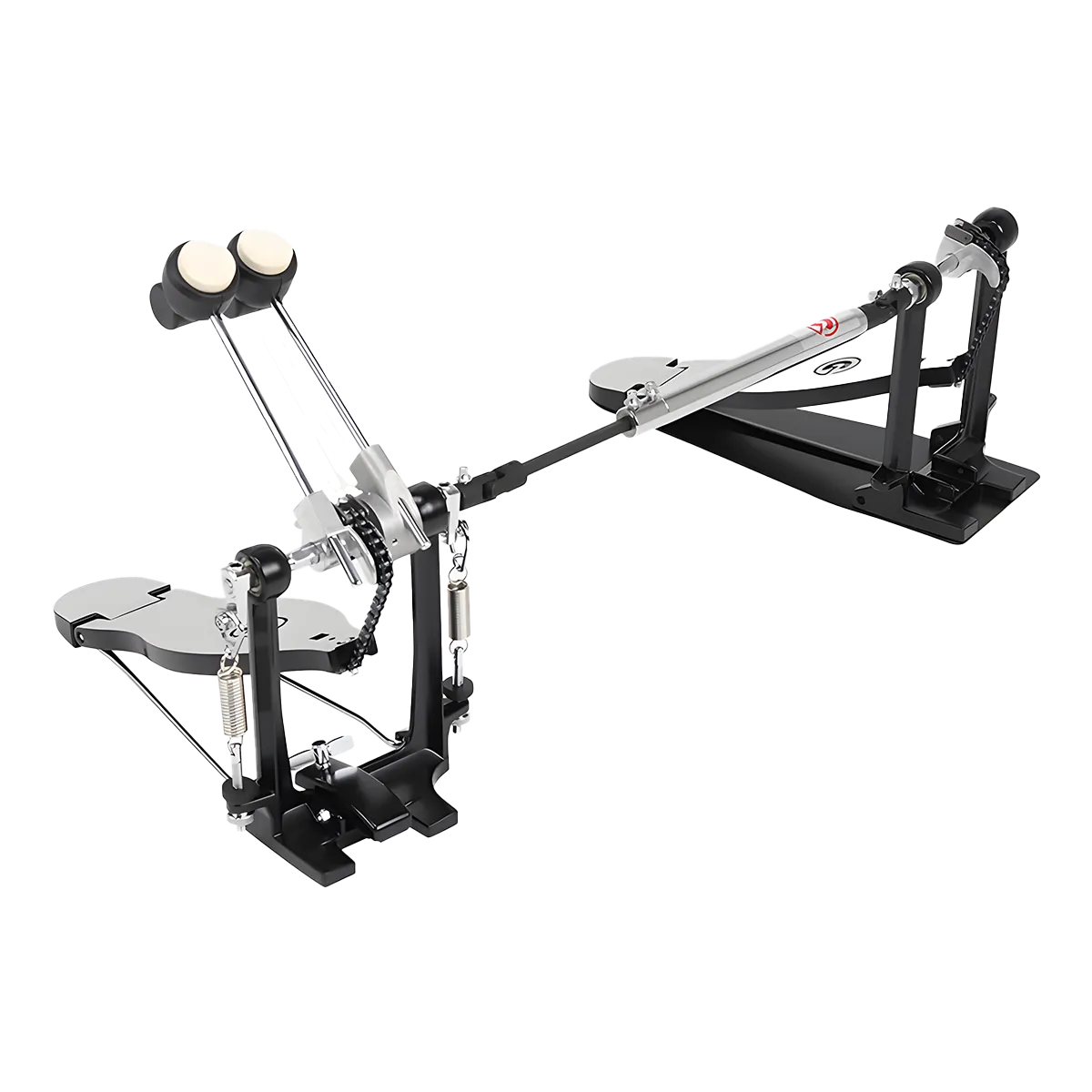 Une double pédale simple chaîne pour batterie légère et robuste, équipée de repose-pieds lisses en forme de G.
