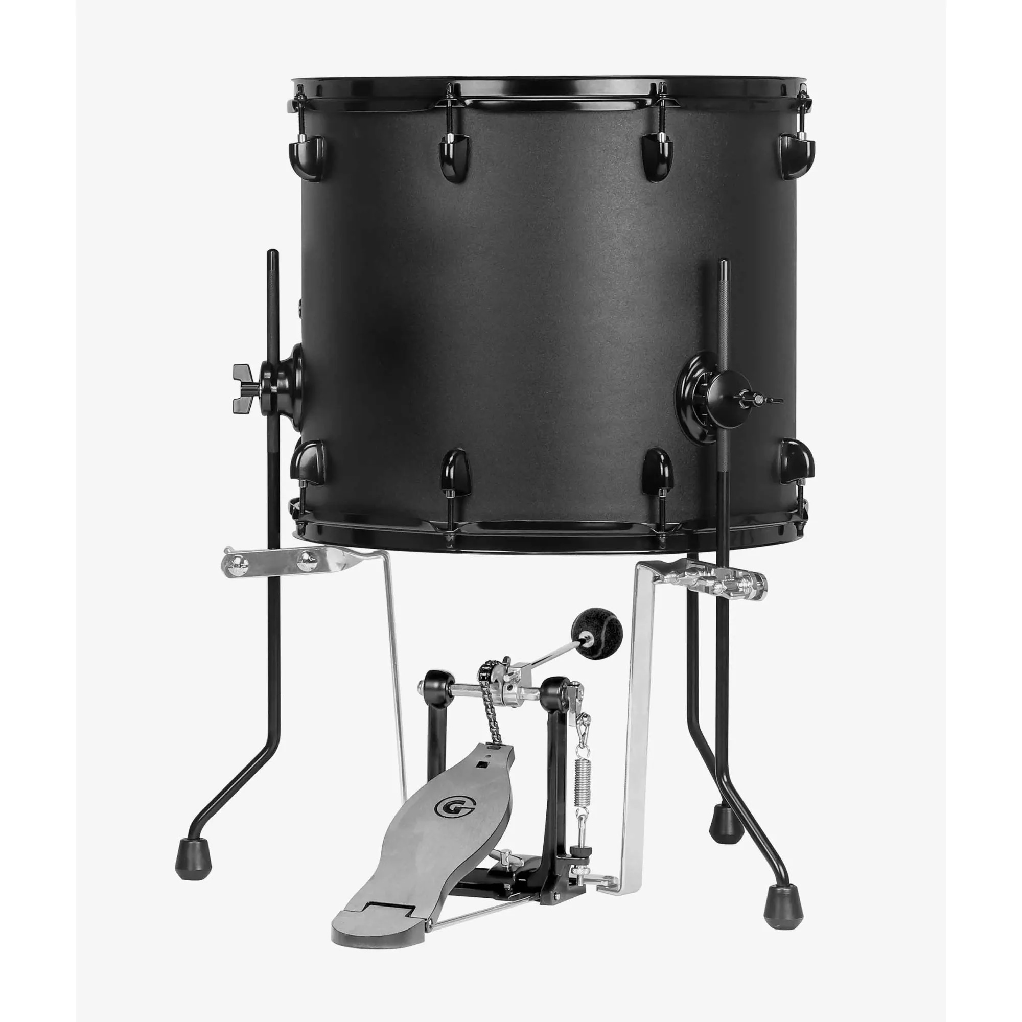 Le support de pédale est équipé de deux bras pivotants qui se connectent et se verrouillent aux pieds du floor tom, permettant un positionnement facile sous le floor tom.