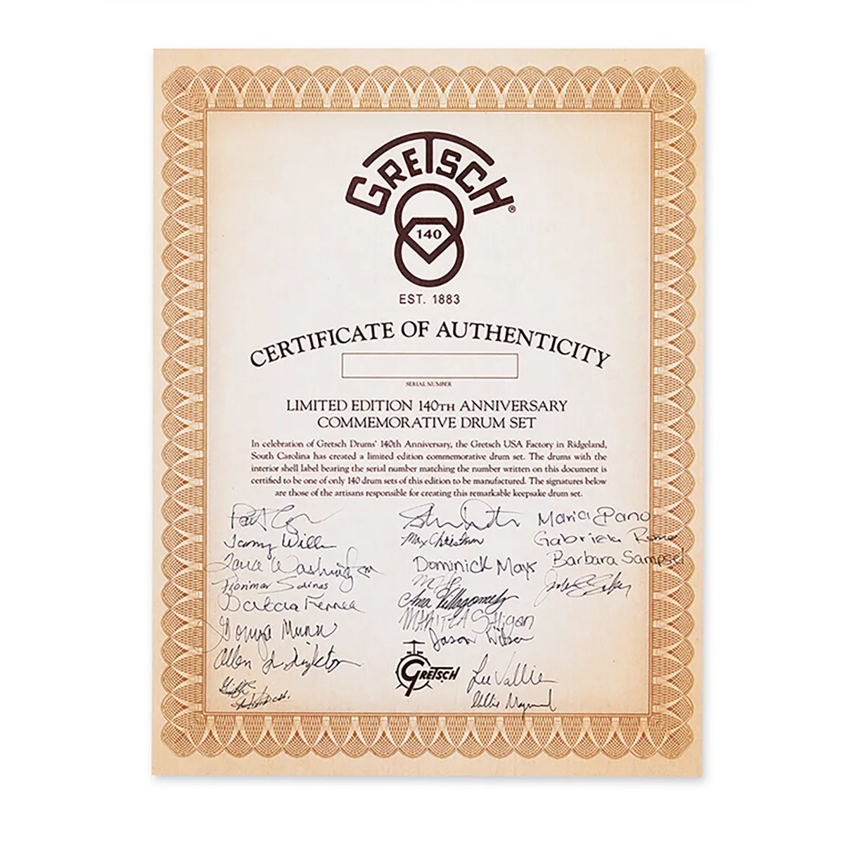 Pour célébrer son 140e anniversaire, Gretsch est fière de présenter la Gretsch 140th Anniversary en édition limitée. Chacun de ces kits est minutieusement construit pour honorer le riche héritage Gretsch et offrir aux batteurs une pièce de collection de l'histoire Gretsch dont les admirateurs se souviendront pendant des années.