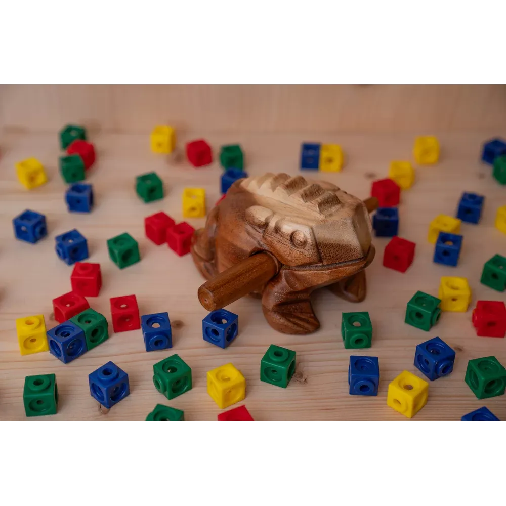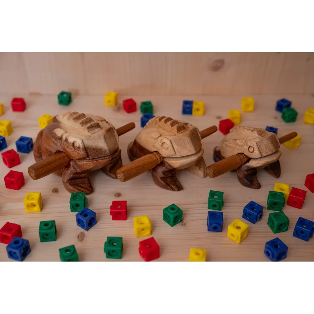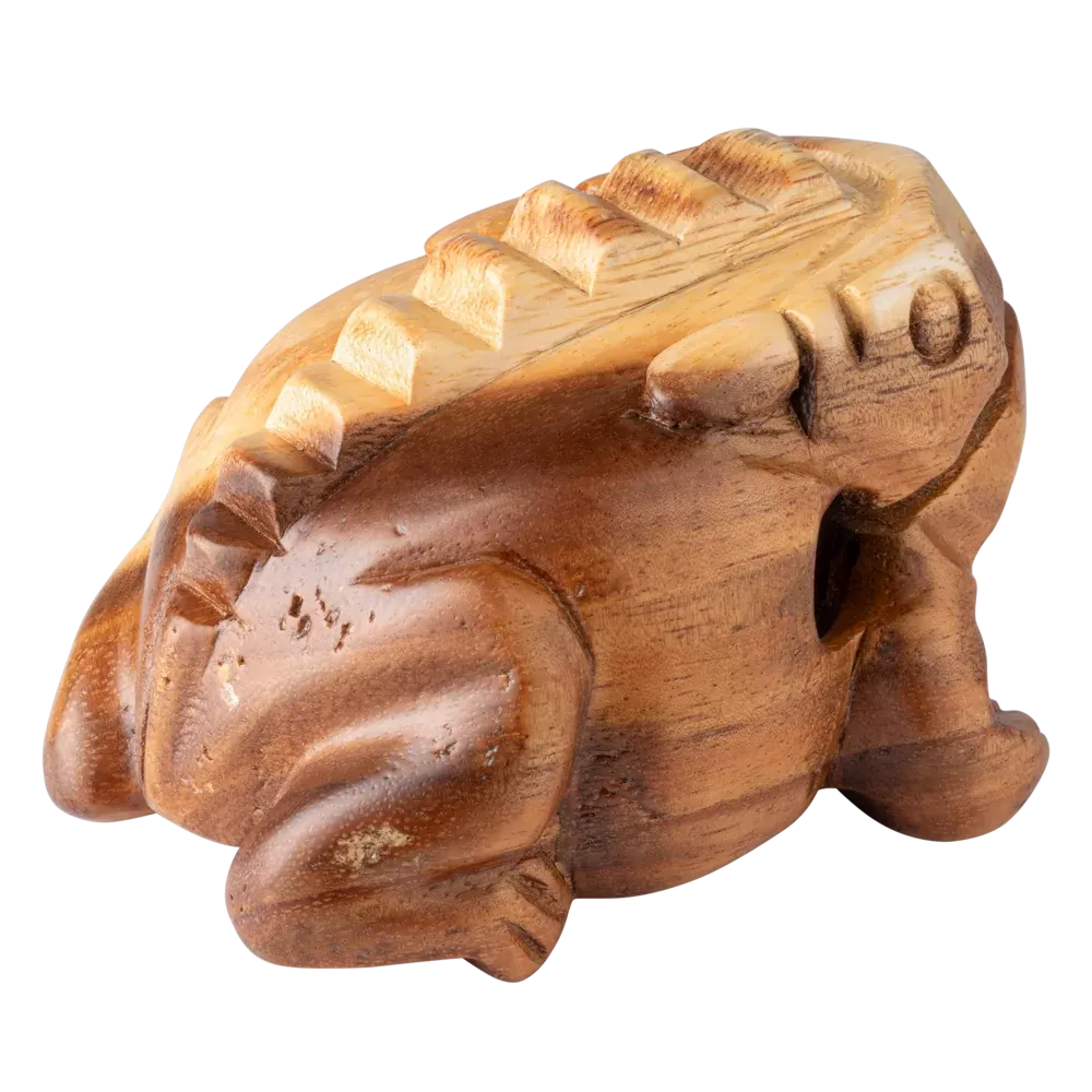 La Grenouille Güiro NINO® Percussion est creuse à l'intérieur avec un dos strié qui crée un son "ribbit" lorsque vous faites glisser la baguette dessus. L'aspect de l'instrument le rend amusant à jouer pour les enfants. Il produit un son chaud et doux qui s'harmonise avec d'autres instruments dans une salle de classe. Les enfants peuvent également en jouer à la maison. Comprend un grattoir en bois.