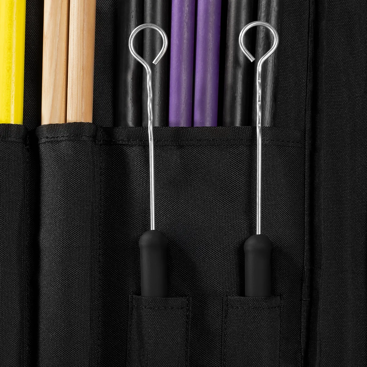 Cette housse dispose de nombreux compartiments pour les baguettes et accessoires. Les poches dédiées aux baguettes permettent de garder les paires assorties ensemble, tandis que les balais ont leurs propres poches pour un accès facile. Les sangles renforcées et réglables pour tom basse et les crochets maintiennent la housse en place pendant le jeu. Une bandoulière rembourrée assure le confort lors du transport.