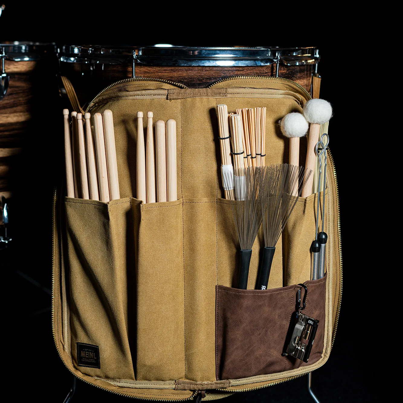 À l'intérieur du compartiment principal se trouvent cinq poches permettant d'organiser un grand nombre de baguettes, balais et mailloches (quatre grandes poches plus une petite poche sur la reliure). De plus, il y a trois poches à accessoires de tailles différentes pour accueillir les petites pièces ou les effets sonores.