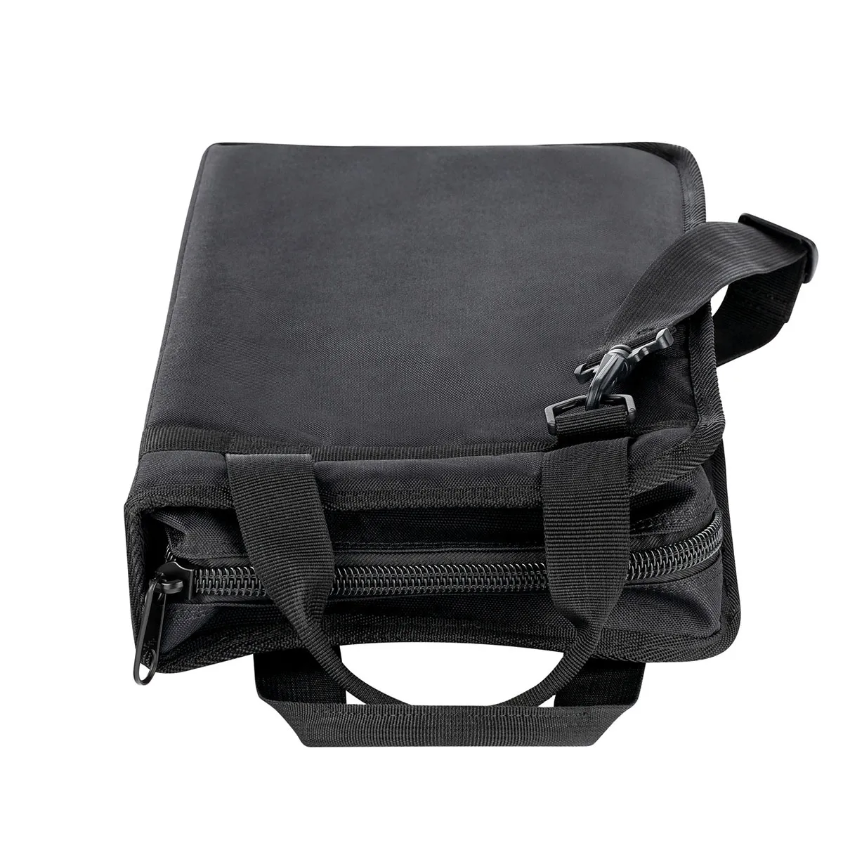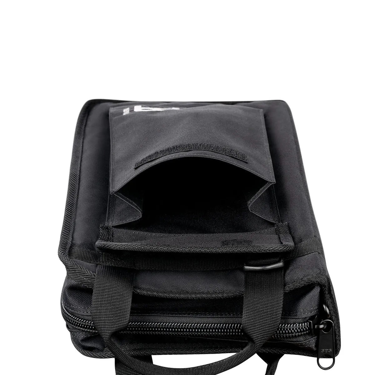 Le sac est équipé de deux options de transport : une sangle d'épaule réglable en longueur et de solides poignées de préhension rapide. Le sac comprend des crochets et des sangles afin de le suspendre en position ouverte à côté de vous sur votre kit. Idéal pour les batteurs en tournée, les percussionnistes, les amateurs et les étudiants. Fabriqué en polyester 600D et PVC, poignées et sangles en PP et fermeture à glissière à double zip.