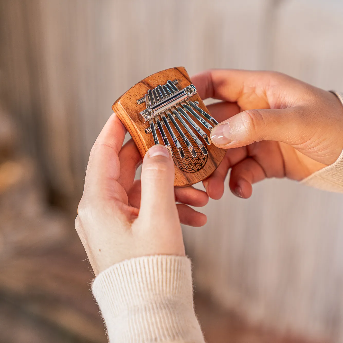 Ce kalimba possède 8 lames en acier sur la gamme de do majeur. Toutes les hauteurs se complètent, ce qui signifie que vous ne jouerez jamais une fausse note. Cet instrument est facile à jouer et ne nécessite aucune formation musicale. Il est idéal pour la thérapie de guérison par le son, la méditation et le yoga, et les enseignants peuvent également s'en servir pour canaliser une classe. Bien sûr, les musiciens peuvent aussi s'en amuser.