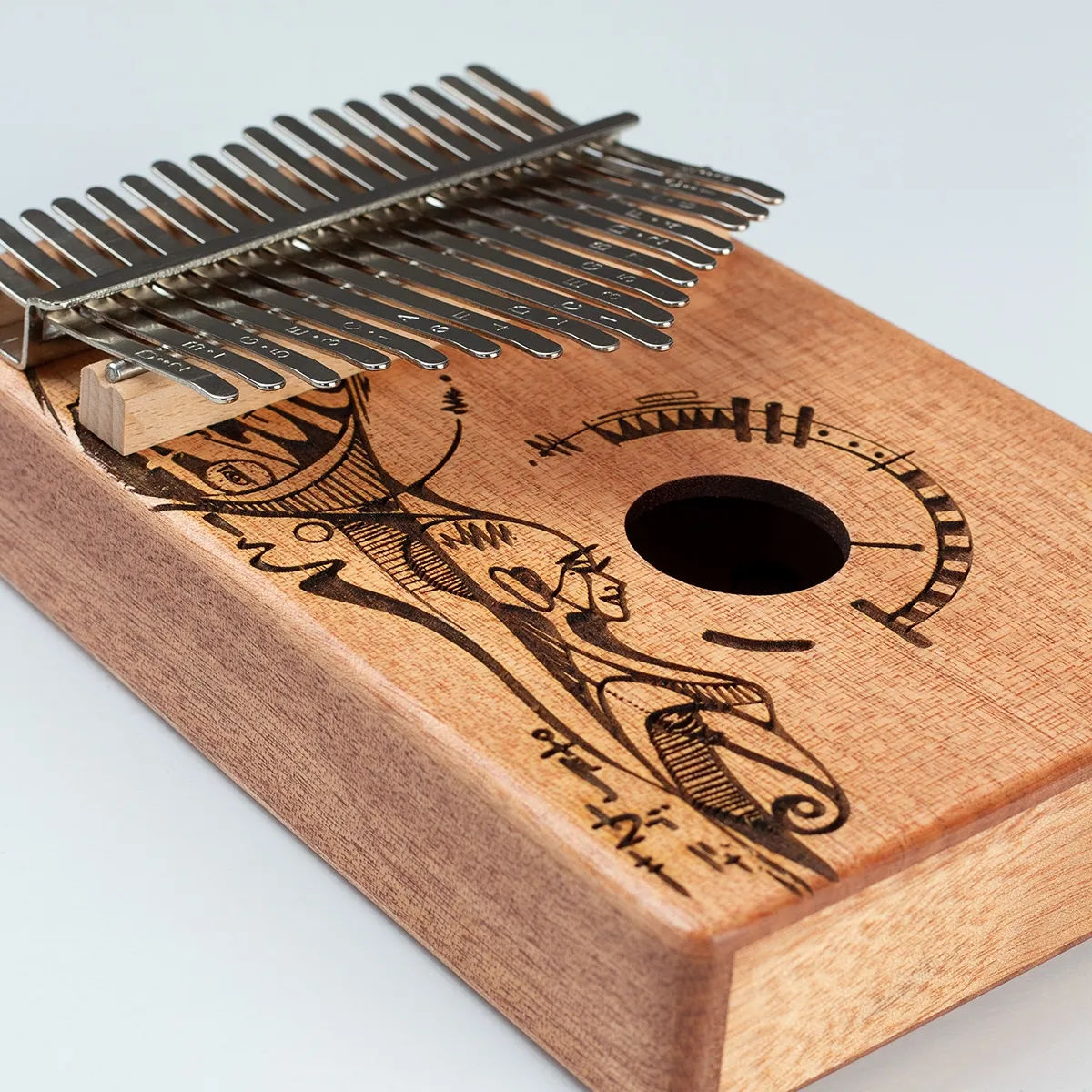 Le kalimba Art Series 17 Peaceful Mind est fabriqué en bois d'acajou de haute qualité et présente un design remarquable et accrocheur. Le corps amplifie les basses fréquences, créant un son plein, clair et chaud avec une résonance fascinante. Les anches métalliques de haute qualité sont accordées en do majeur et ont une tessiture de Do4 à Mi6 (C4 - E6). Grâce aux notes estampillées sur les anches, la kalimba convient aussi bien aux débutants qu'aux musiciens confirmés.