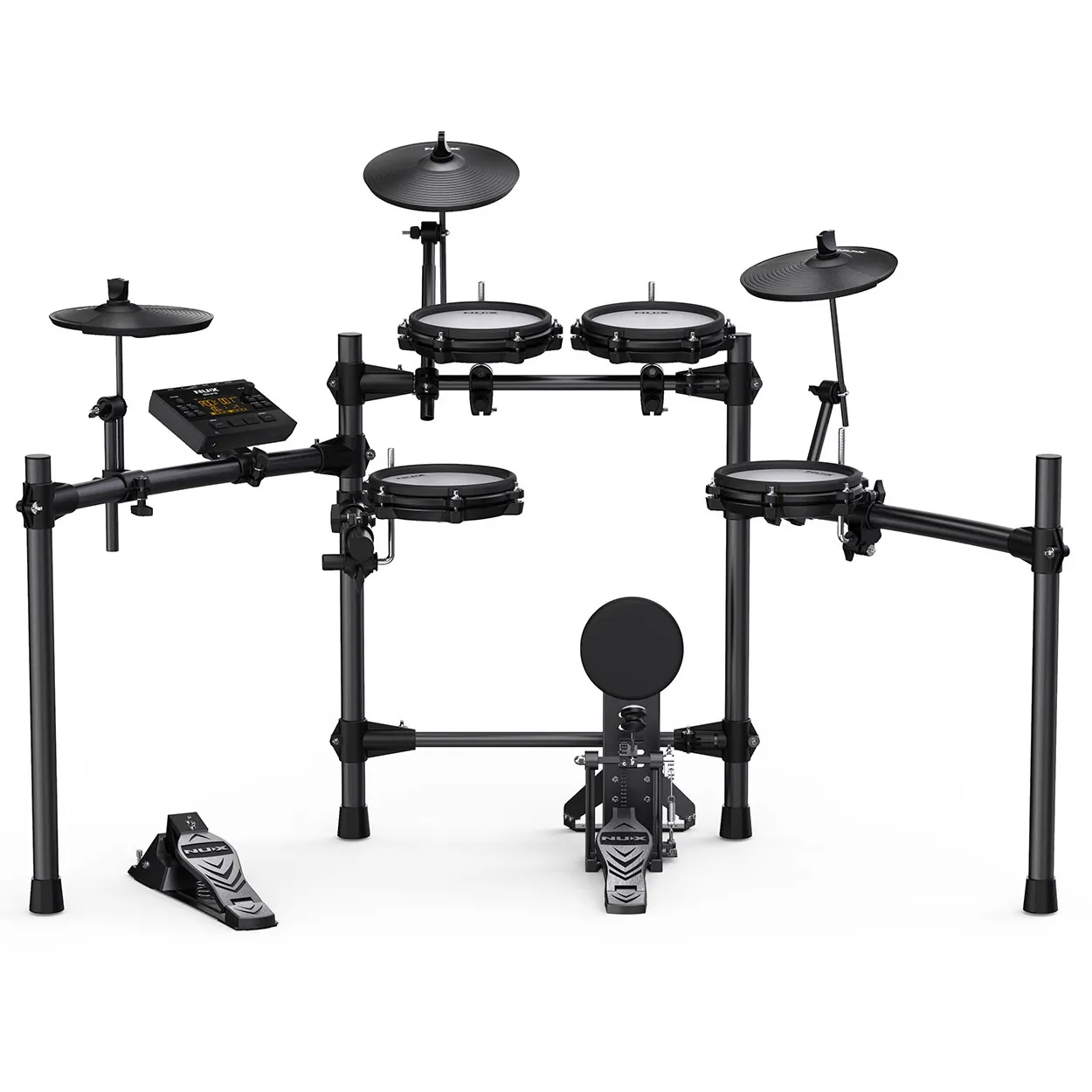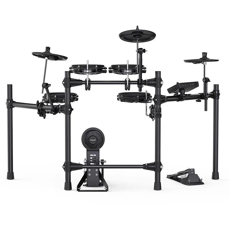 Expérience de batterie parfaite Le nouveau kit NUX DM-210 est un nouvelle batterie d'entrée de gamme équipé entièrement de peaux maillées. Vous pouvez facilement personnaliser la sensation de frappe pour votre style en ajustant la tension de vos peaux.