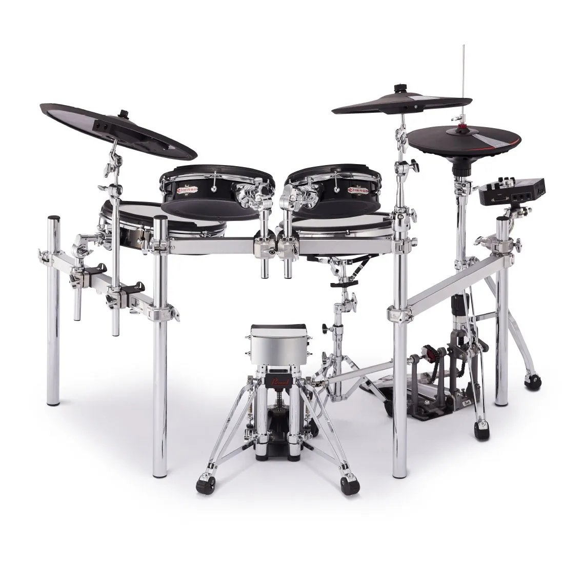 Chaque kit e/MERGE comprend un ensemble de cymbales électroniques PUREtouch composé d'une ride 18" à trois zones (cloche, corps et bord), d'une Crash 15" à deux zones (corps et bord) et d'un Hi-Hats 14" à deux zones (corps et bord). Les cymbales PUREtouch Crash et Ride ont une fabrication multicouche enveloppées dans du caoutchouc avec une sensation de jeu similaire à celle des cymbales acoustiques, mais avec un toucher légèrement plus doux pour un volume sonore contrôlé. Les cymbales PUREtouch ont une spécificité, basée sur la gestion de fréquences, qui mélange les sons de bord et de corps en accord avec l'endroit où vous frappez la cymbale. La plupart des cymbales électroniques comportent une fonction "chocking" qui coupe le son directement lorsque vous saisissez le commutateur situé sous la cymbale. Avec la fonction d'étouffement naturel des cymbales PUREtouch, celle-ci élimine le son et déclenche immédiatement une harmonique naturel inhérent à l'étouffement des vraies cymbales acoustiques. Ce sont les cymbales électroniques à sonorité la plus naturelle qui soit à ce jour.