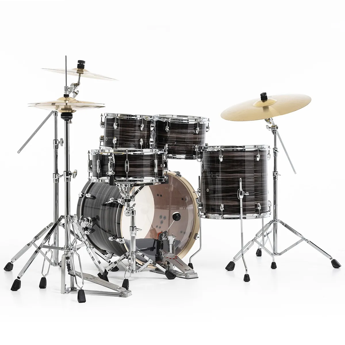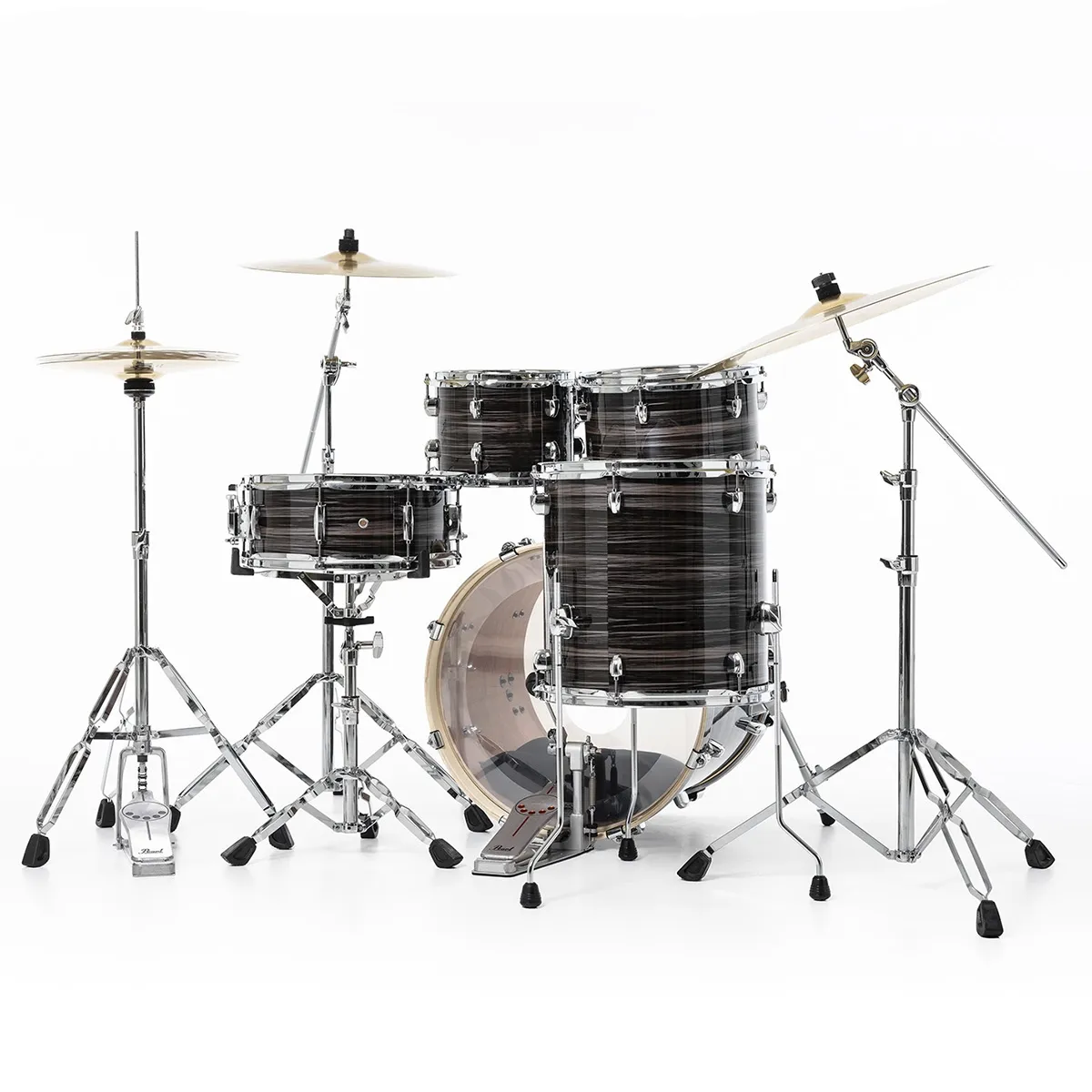 Question bois, Pearl a réussi ici l’exploit de reléguer au placard des nanars les fûts en bois de cagette de certaines marques à bas coût au profit d’une combinaison à six plis de peuplier et d’acajou, une association évidemment gagnante. Un souci de qualité qu’on retrouve sur les différents stands, notamment ceux de la caisse claire et des cymbales dotés du système UniLock à l’efficacité redoutable quelle que soit la position choisie.