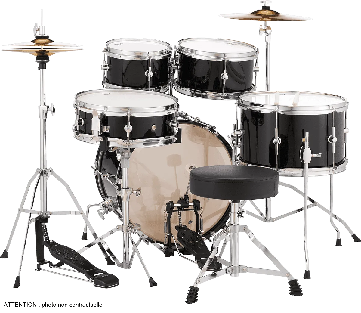 - Accessoires : 1 pédale de grosse caisse, 1 siège, 1 set de cymbales (hi-hat 10" et crash 13")