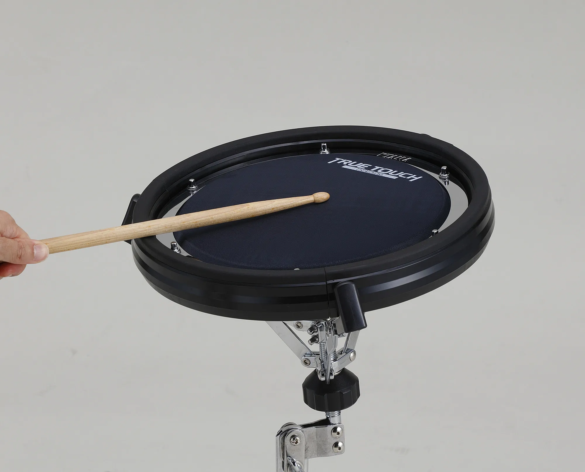 Le True Touch AAD Snare Pad de TAMA offre une expression dynamique, une articulation et une précision optimales dans un pad d'entraînement. Le pad intègre une conception multicouche utilisant des matériaux de base solides et lourds et des matériaux de mousse multicouches. Une source sonore cachée à l'intérieur du coussin produit un son de caisse claire dynamique à réponse immédiate. Ce "retour sonore" donne au batteur des informations essentielles pour affiner sa technique. Le matériau de la couche supérieure en maille à deux plis produit une réponse réaliste de la baguette et peut être "réglé" de bas en haut pour "composer" la sensation du joueur. Le cerclage supérieur est surélevé, comme un véritable cerclage de batterie, pour permettre aux batteurs d'accentuer les coups de rimshot et de jouer des techniques de baguette latérale.