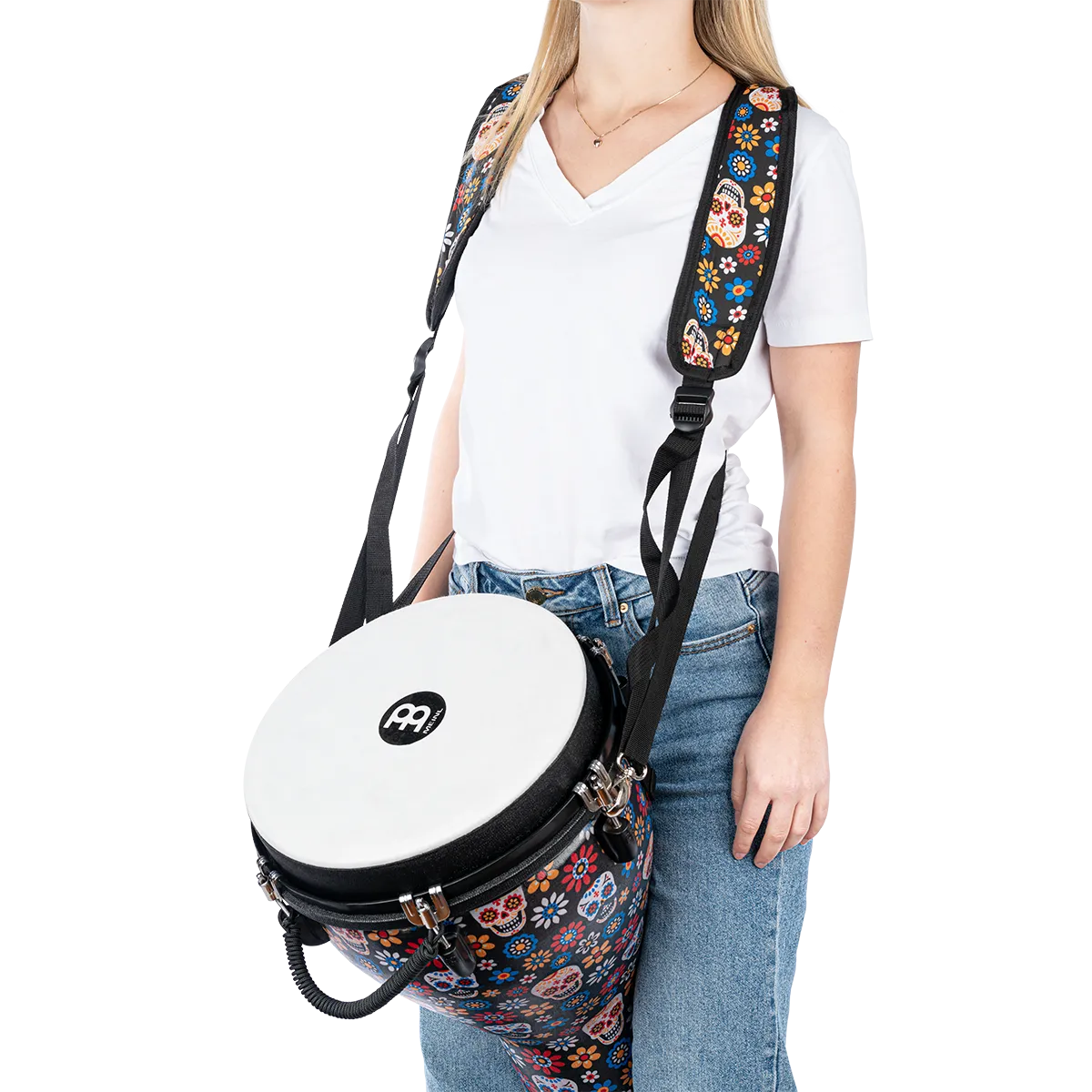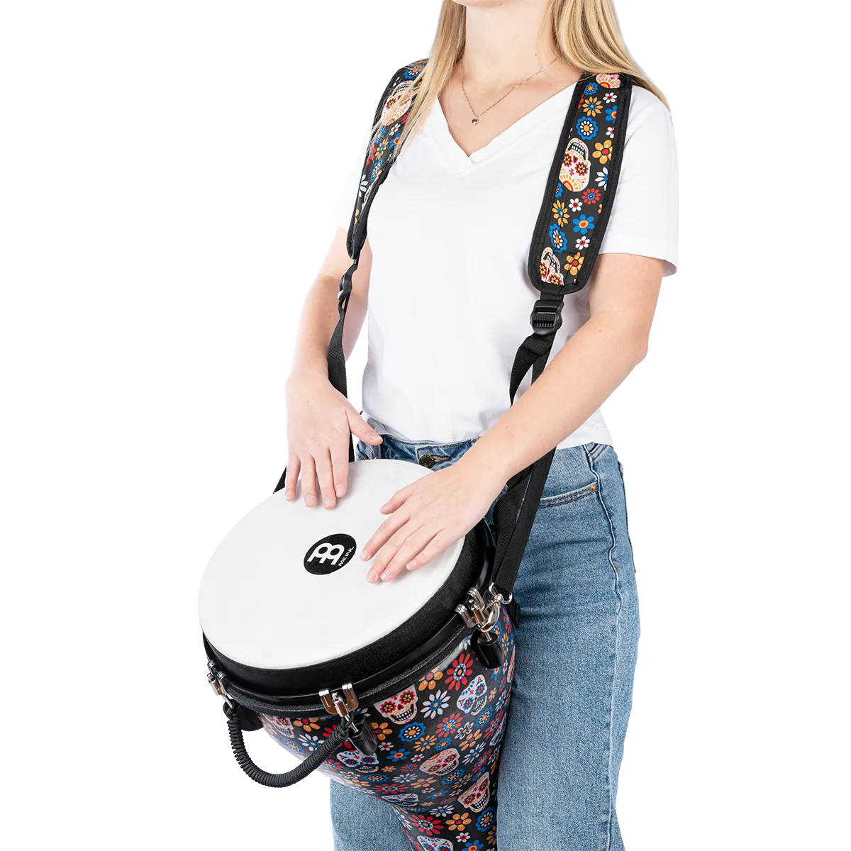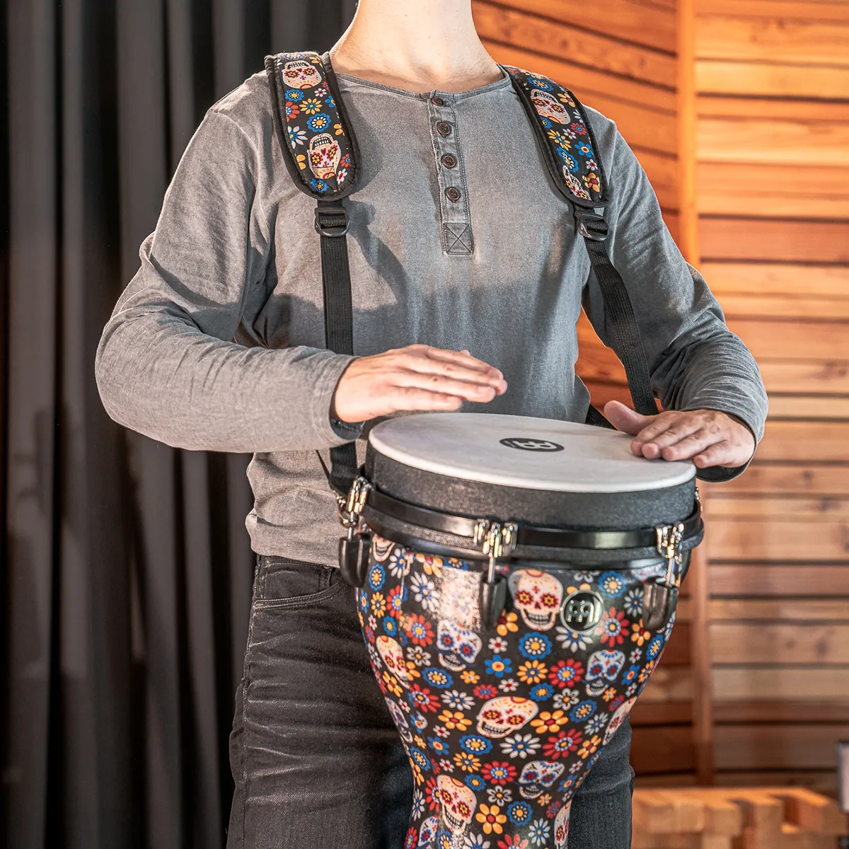 Pour les joueurs de djembé mobiles, se tenir debout et se déplacer pendant le spectacle nécessite une sangle solide pour maintenir son instrument confortablement en place. La sangle de djembé Meinl Percussion Designer est fabriquée à partir d'un matériau synthétique robuste qui maintient votre djembé fermement en position de jeu, vous laissant libre de vos mouvements. Les sangles en PP épaisses et sanglées, réglables en longueur, vous permettent de trouver la position idéale. Design "Day Of The Dead".