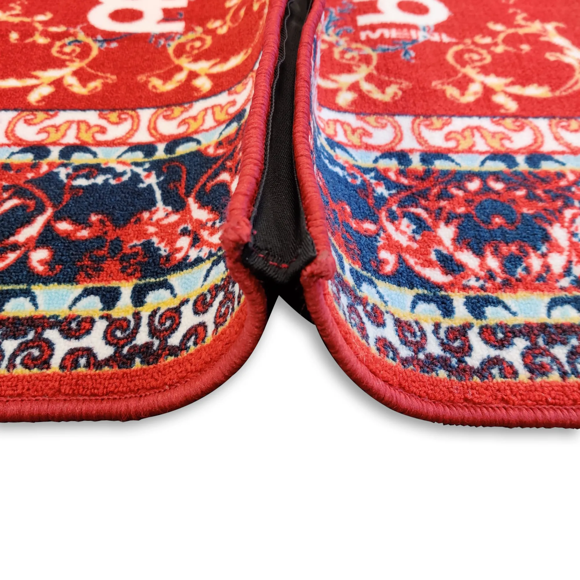 Ce tapis de 2 x 2 m est divisé en deux parties reliées par une jointure cousue élastique. Le tapis plié et roulé ne mesure plus ainsi qu'un mètre de long, de manière à être plus facilement transportable