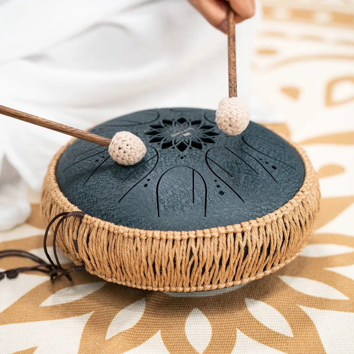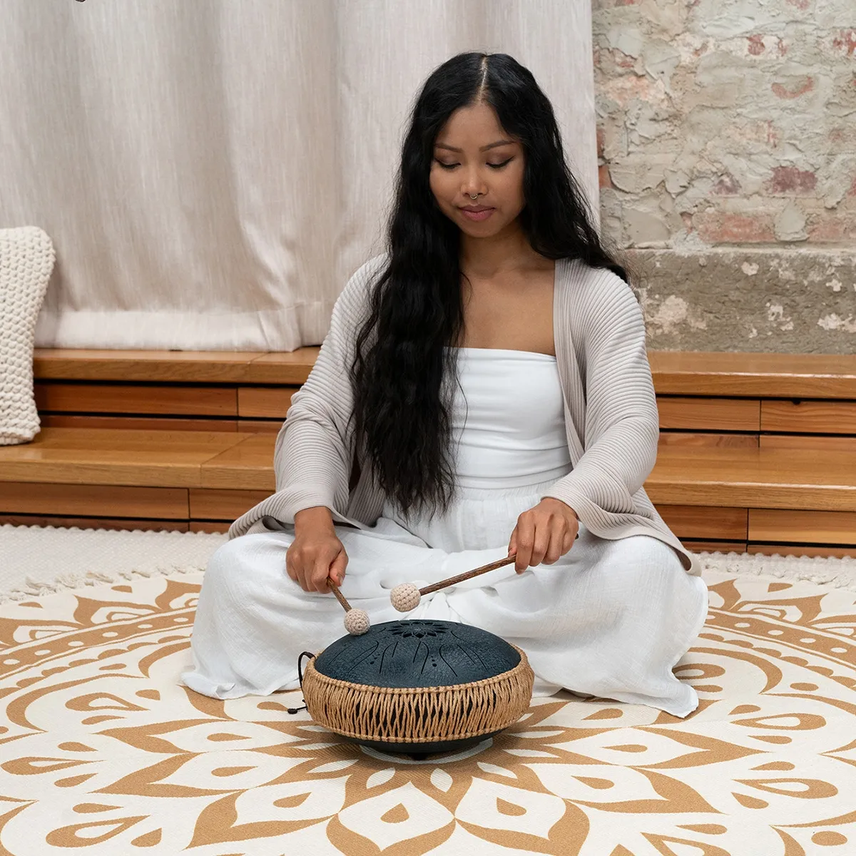 Le Tongue Drum en acier Meinl Sonic Energy 10" Medium Octave est fabriquée en acier inoxydable de haute qualité. Ses huit notes sont réparties sur deux octaves. Permettant d'obtenir un son merveilleux et méditatif, rappelant celui du handpan. Un event situé sur la face inférieur peut être bouché à l'aide d'un bouchon en silicone afin d'obtenir un son encore plus compact/étouffé. Trois pieds en silicone situés à la base l'empêchent de glisser. Le Tongue Drum est un instrument pouvant être jouée avec les doigts ou avec des mailloches. Pour commencer à jouer, il suffit de le poser sur une surface plane ou sur vos genoux. Livrée avec deux mailloches en bois avec têtes caoutchouc enveloppées de tissu tressé et d’une housse de transport avec une fermeture éclair et une poignée.