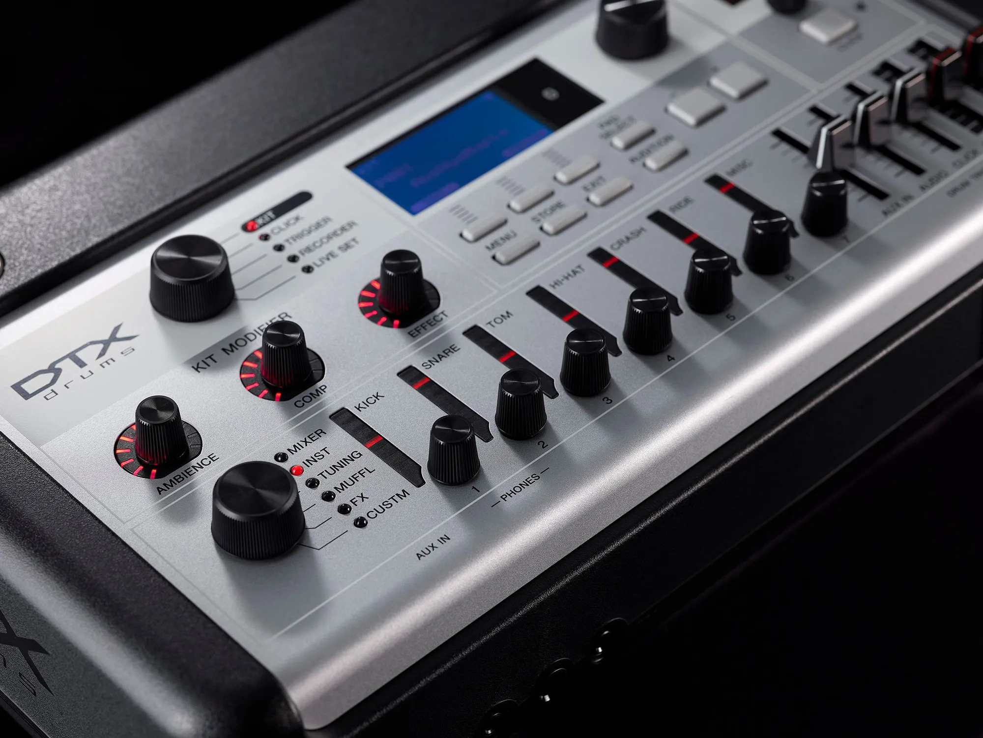 Le DTX-PROX est un nouveau module de batterie phare qui permet à tout batteur de personnaliser intuitivement ses sons de haute qualité. Doté de véritables sons de batterie échantillonnés et d'une véritable ambiance de salle, échantillonnés dans des studios de renommée mondiale, de boutons KIT MODIFIER qui vous permettent de modifier facilement et radicalement les sons d'un simple tour, et de faders rotatifs à DEL qui vous permettent de modifier intuitivement n'importe quel réglage, le DTX-PROX donne forme à votre créativité intérieure de batteur. Il est compatible avec l'application iOS/Android Rec'n'Share, qui vous permet d'accompagner des morceaux de musique et de vous entraîner efficacement. La fonction Bluetooth vous permet de connecter facilement des appareils intelligents, et vous pouvez également enregistrer votre jeu, et le son d'autres appareils, sur une clé USB.