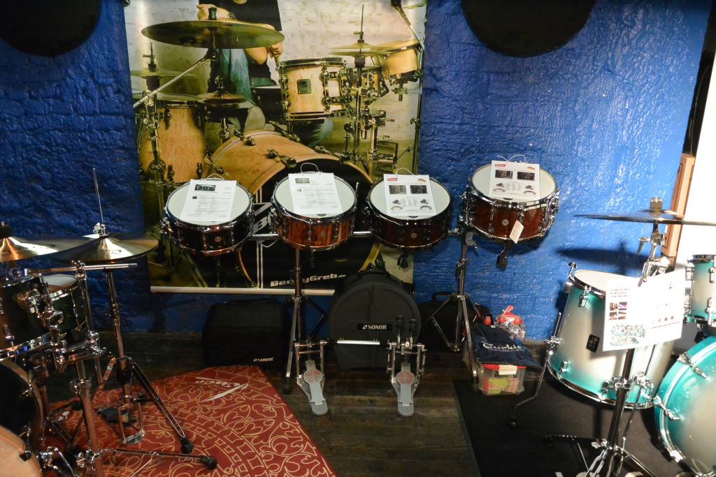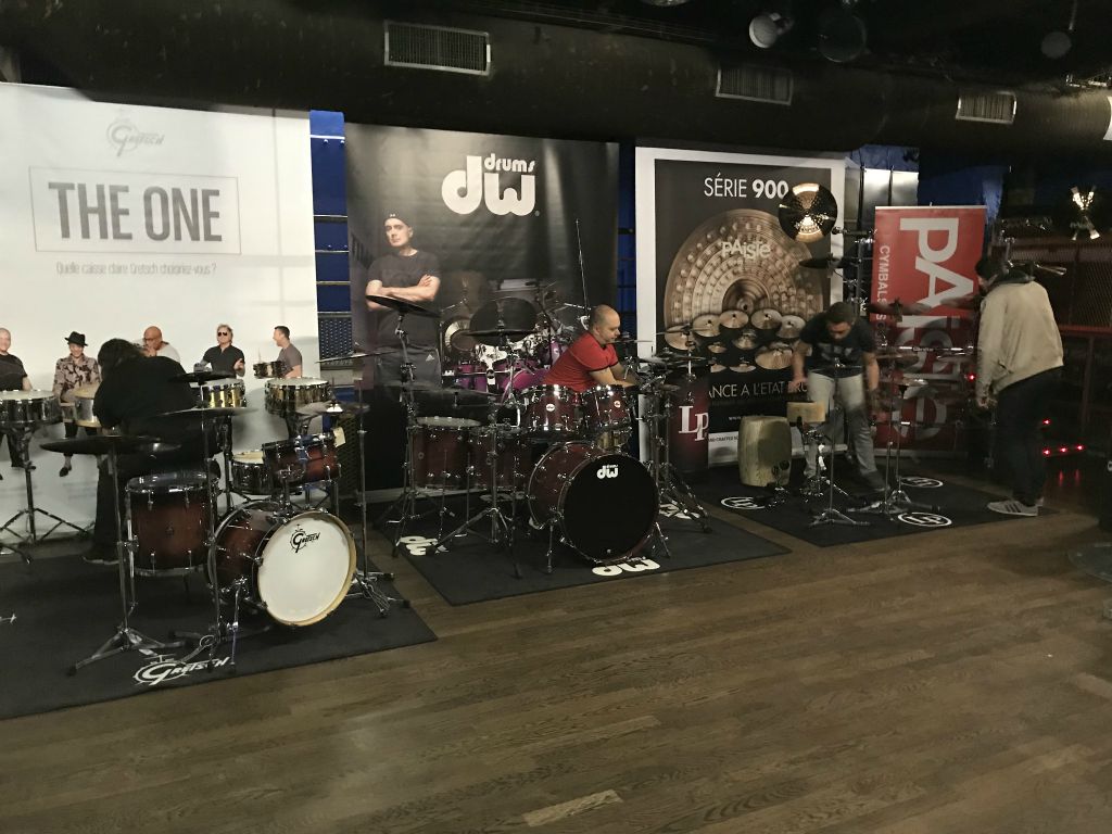 Petite visite guidée des stands. Ici le stand Gewa qui présentait un kit Grtsch, un kit DW et un set percu LP