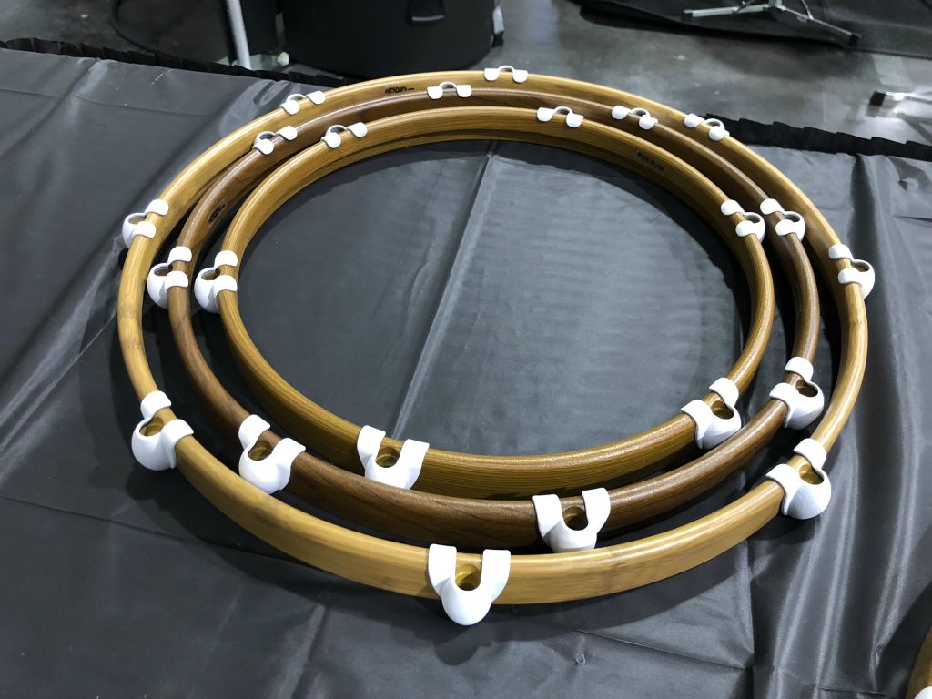 la marque Fathoop propose des cercles enbois massif ou en aluminium de 10 mmm dépaisseur. Porquoi pas, le son restitué ramène moins d'harmonique qu'un cercle traditionnel embouti. En revanche même son qu'un cercle moulé...