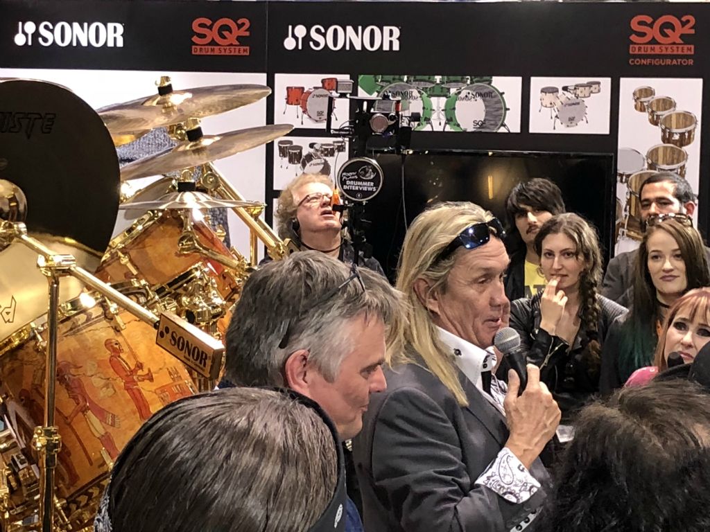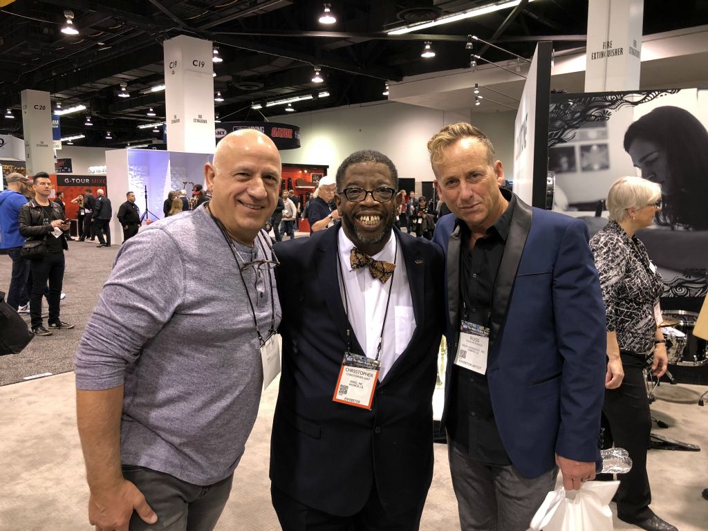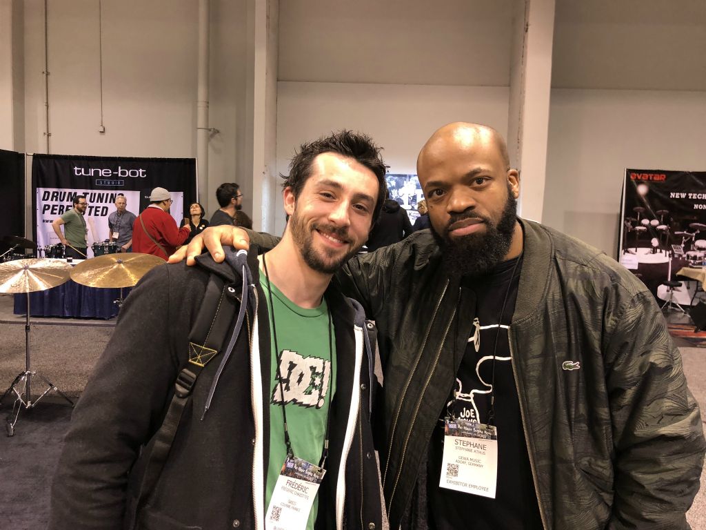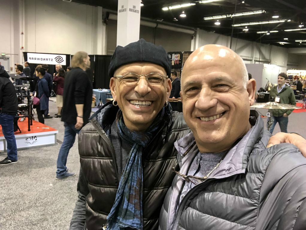 Visite du stand Remo et rencontre avec un viel ami, batteurs légendaire des Tower Of Power Russ Mac Kinnon et l'incontournable et adorable artist relation de chez Remo Chris Hart doint ke reparlerai plus loin dans ce reportage