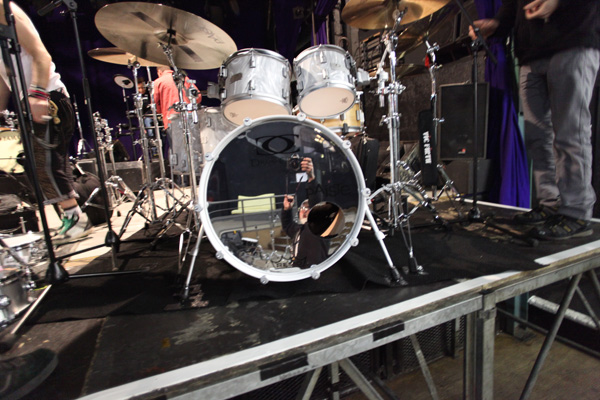 Notez la position penchée vers l'extérieur des toms basses. Nous avons essayé en coulisses et ça marche très bien!