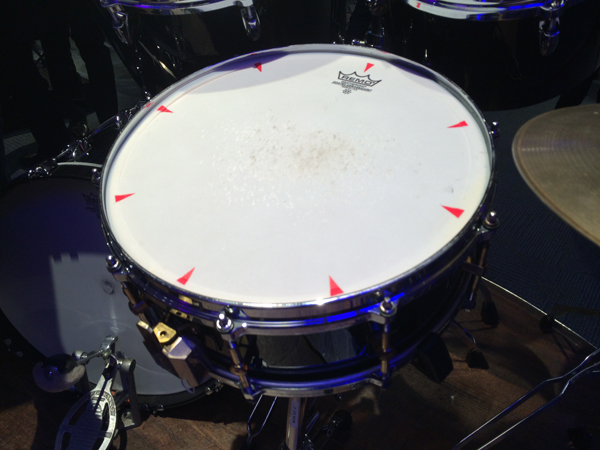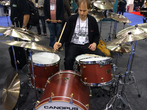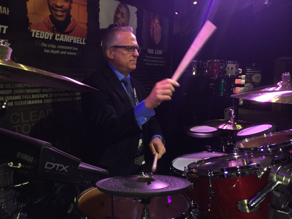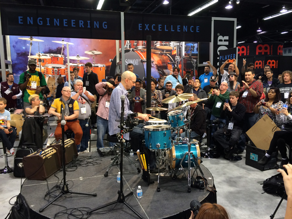 Steve Smith en pleine démo sur le nouveau kit Sonor Martini (grosse caisse de 14")