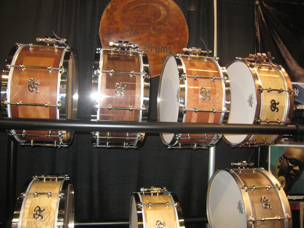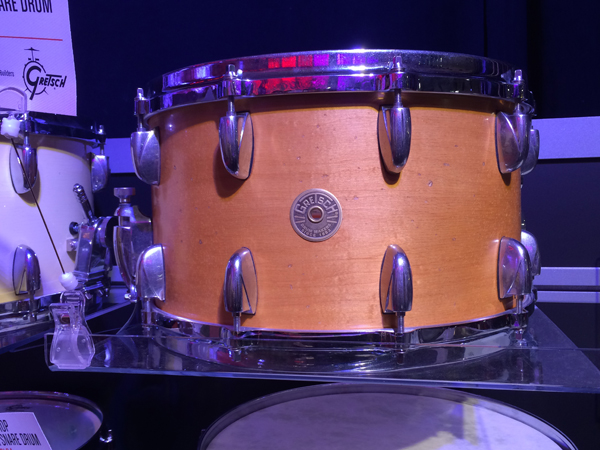 Une série de caisses claires chez Gretsch avec marqueterie plus ou moins de bon goût.