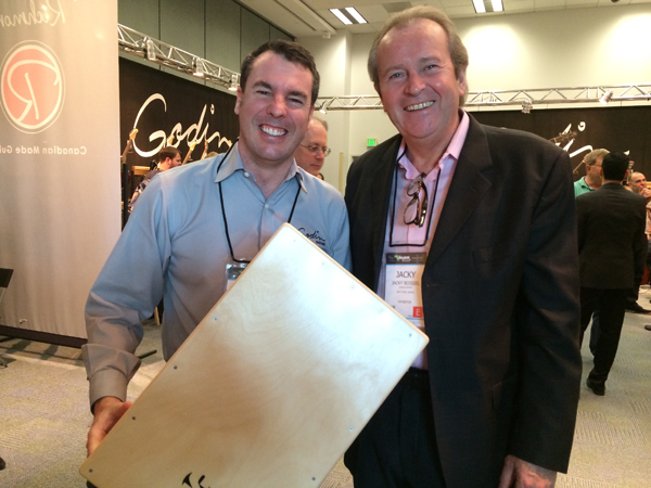 Jacky Boissel en compagnie de Patrick Godin fils de son père Robert Godin, nous présentant une gamme de Cajon