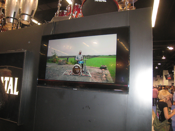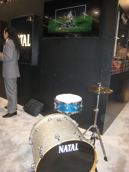 Notre ami Julien Audigier était à l'honneur avec son clip dans lequel il utilise une grosse caisse et une caisse claire Natal, exposées sur le stand sous sa vidéo en boucle.