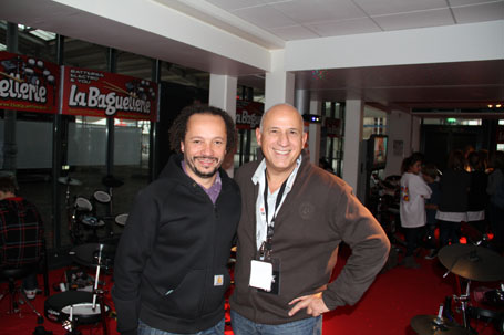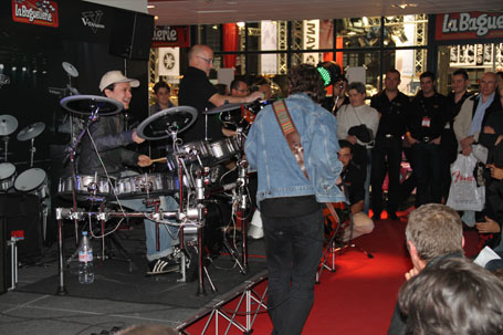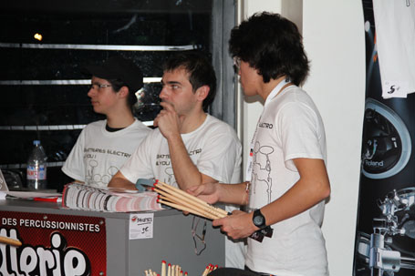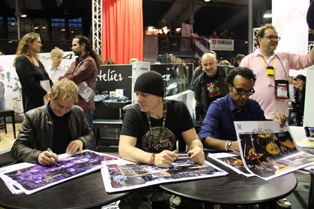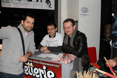 Sur le stand Yamaha, Hervé Koster, Loïc Pontieux et Manu Katché signaient quelques autographes. En arrière plan François Constantin et Nico Filiatreau (taxi Yamaha)