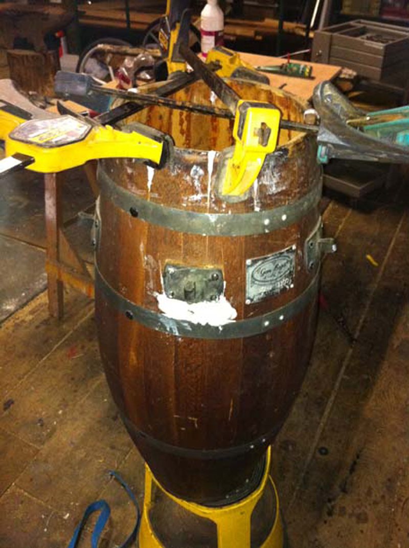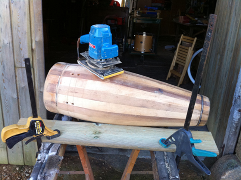 Congas Trouvées sur le net en piteux état. Après le recollage, le ponçage des lattes de hêtre et d'acajou,...