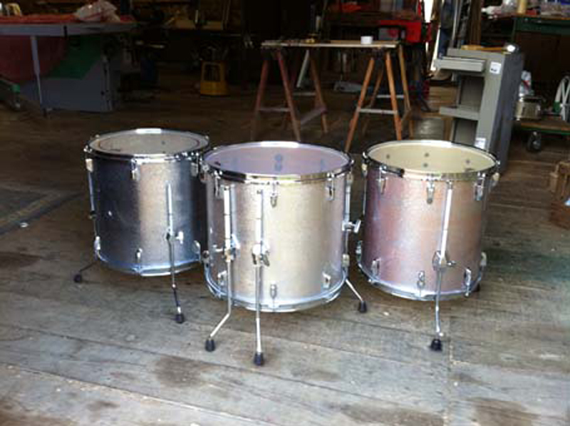 On les voit ici aussi à gauche avec notre kit 20, 13, 16 Gretsch Round Badge Grey Sparkle.
