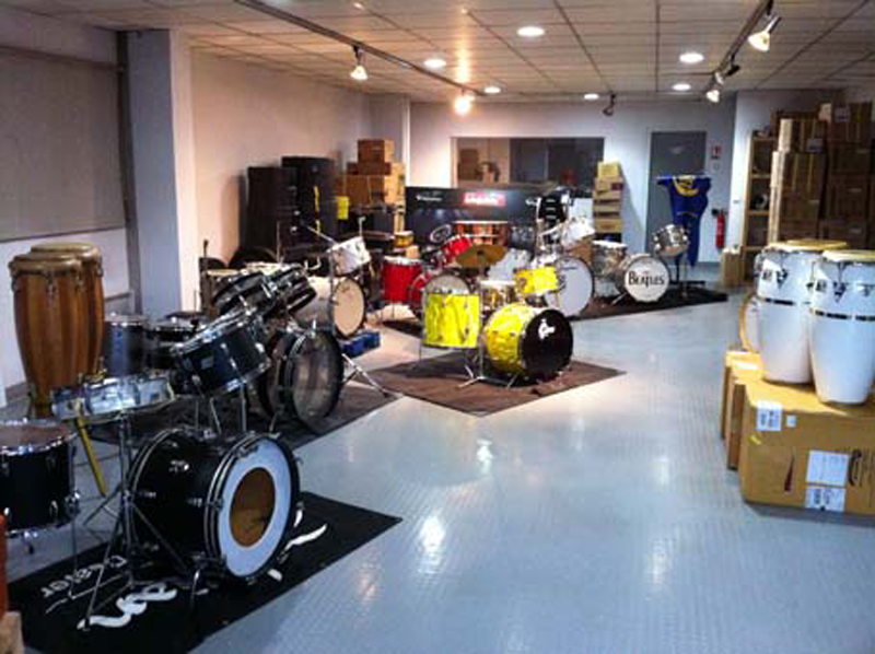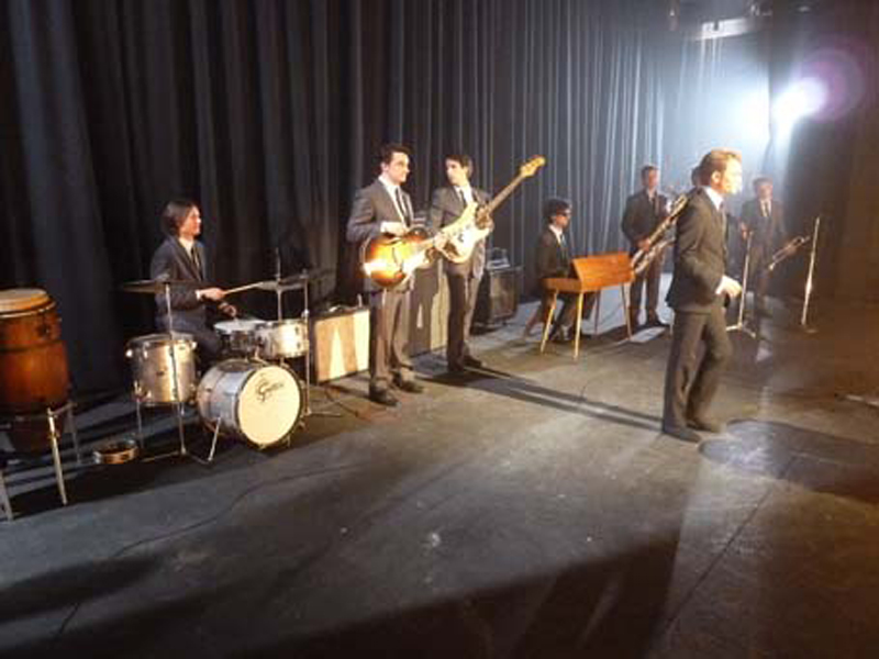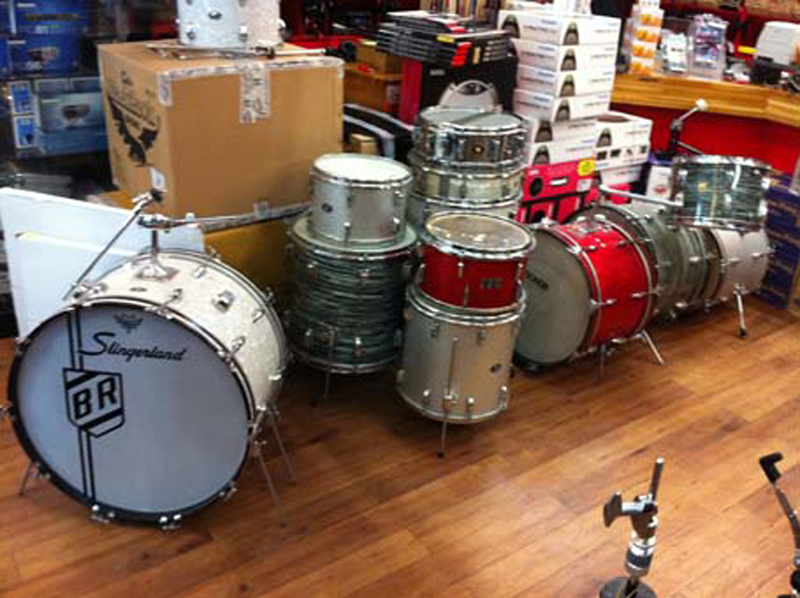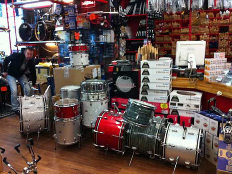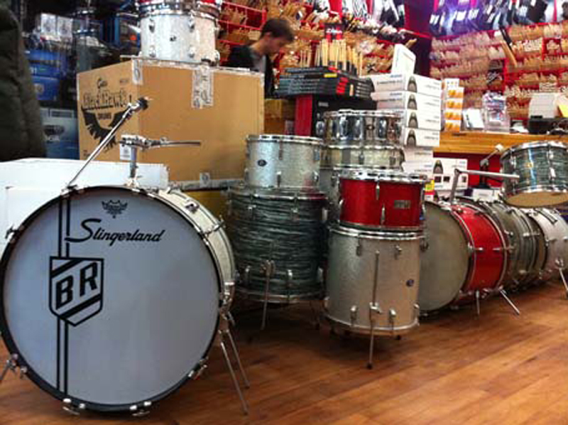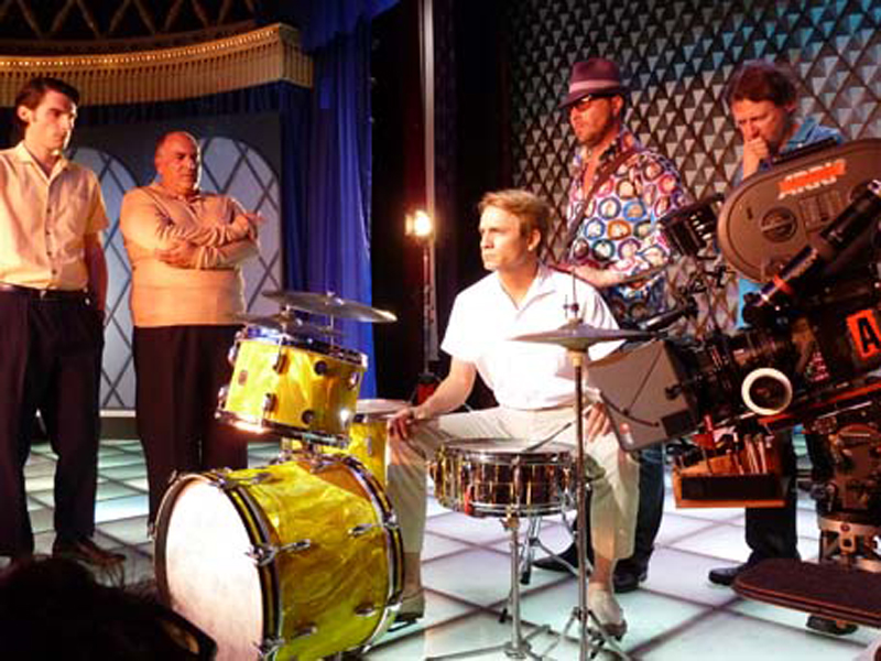 Dans notre show room d'Aulnay Sous Bois nous avions exposé tous les kits pour faciliter la tâche au régisseur. Vous apercevez le kit Gretsch Round Badge jaune moiré que l'on retrouve ci dessous dans une sène du film.