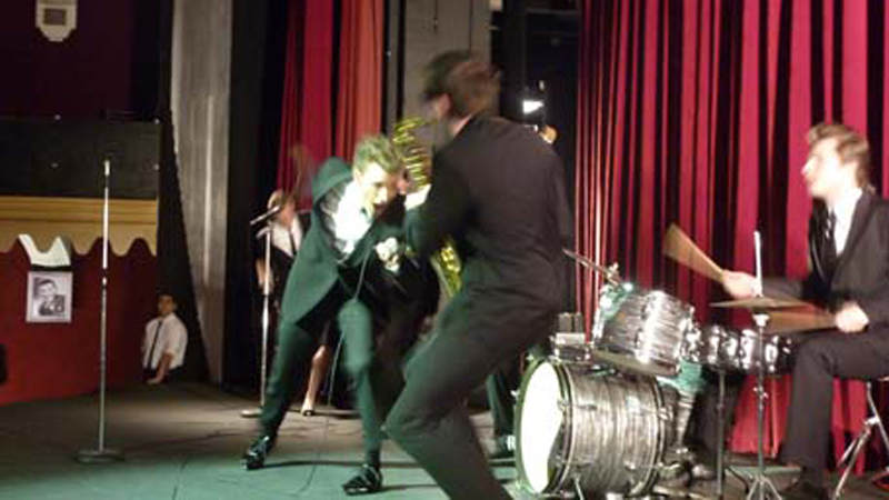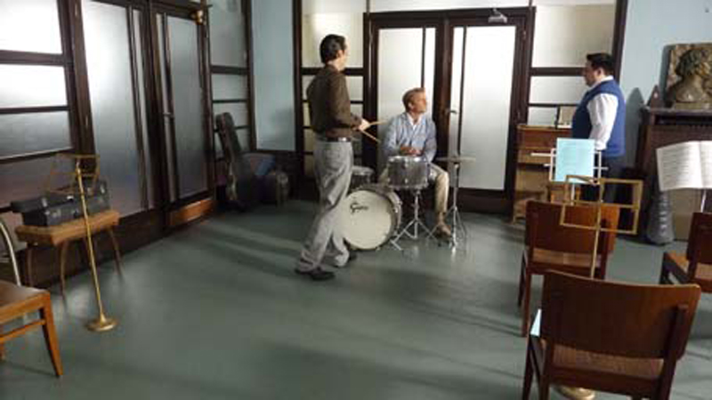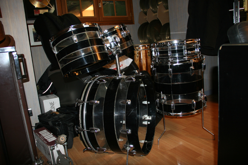A droite sur cette scène du film le kit Vistalite et à gauche une superbe Slingerland 24" en remplacement d'une "North"utilsée à l'époque mais que je nous n’avons pu trouver à temps.