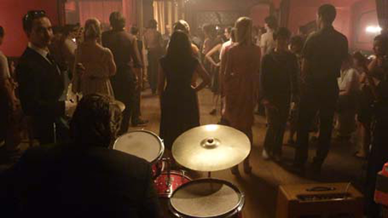 Ici une scène du film avec un kit Sonor 20, 13, 16 + CCL Tear Drops Blanc Moiré