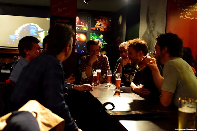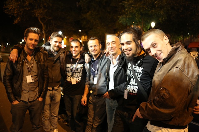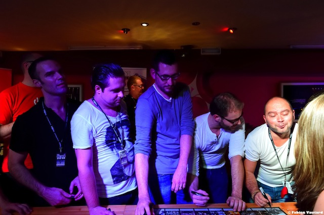 Détente le samedi soir avant le grand Show. Franck Drouillac, Serge Abraham, Christophe Ptak, Stéphane Durin, Alban, Pierre Masse et Fred Chazottes.