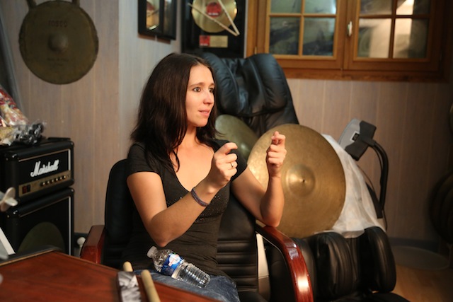 Charmante visite d'Emmanuelle Caplette à la Baguetterie en copagnie de Thierry Lalite et de Laurent Bataille (journaliste Batteur Magazine)
