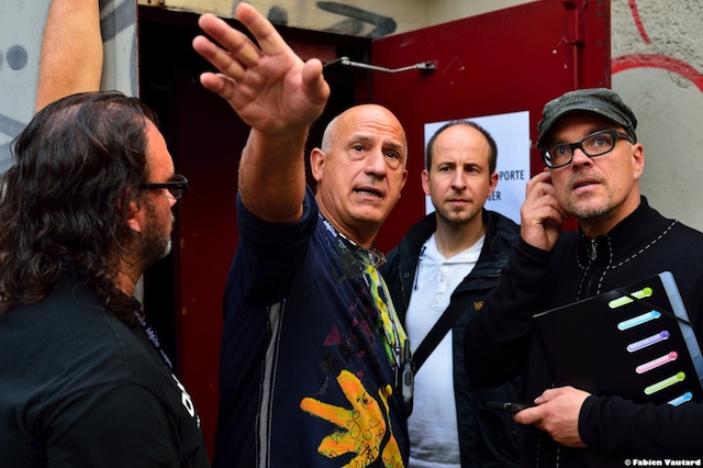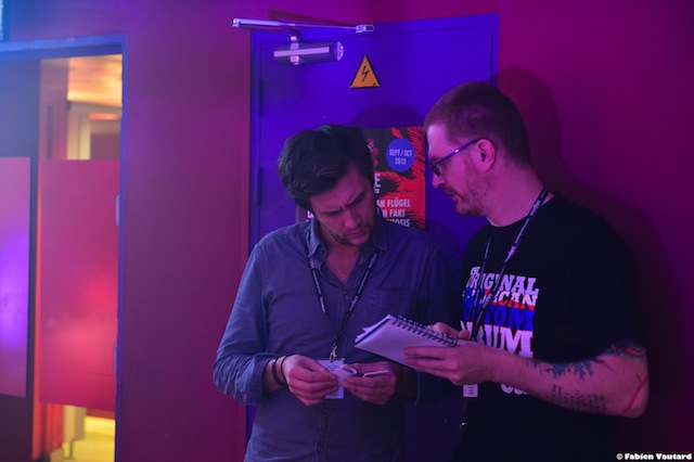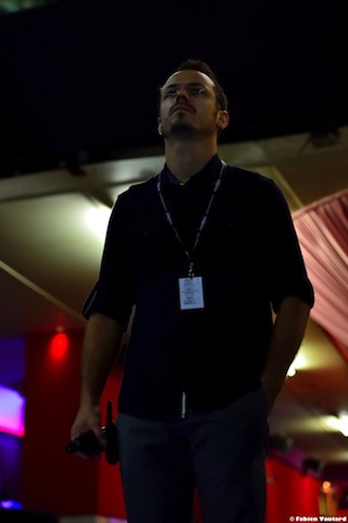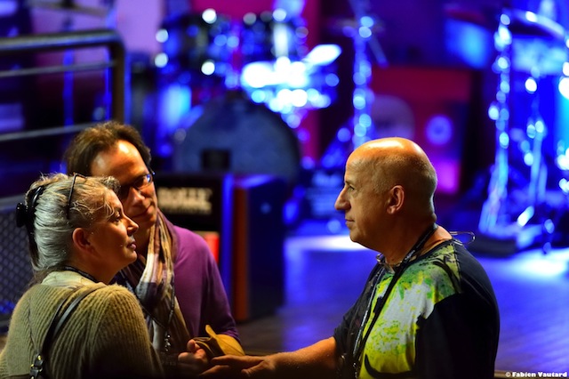 Franck Drouillac donne ses dernières instructions sur scène à Pierre et Fred avant l'ouverture des portes